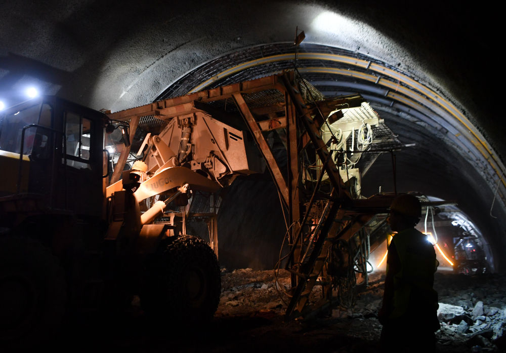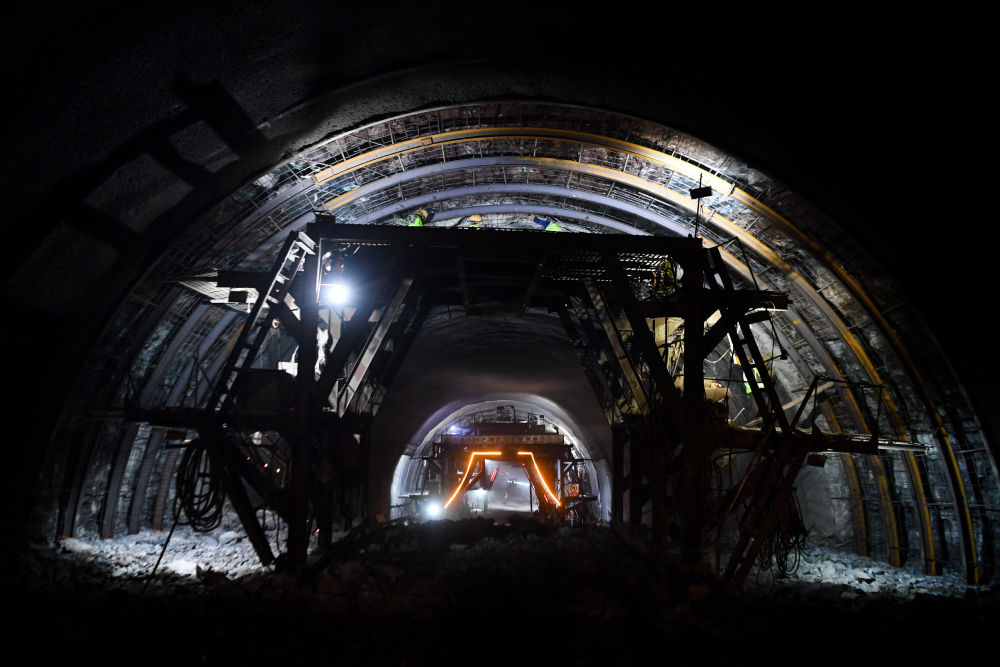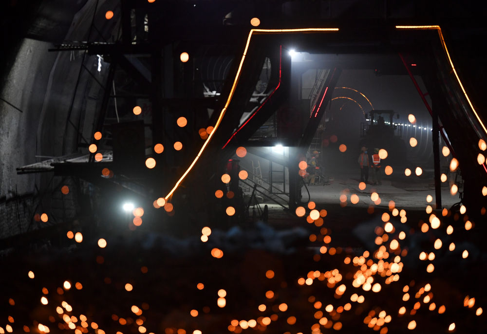 ↑9月1日,施工人員在位于陜西省寶雞市麟游縣的麟法高速石臼山隧道內(nèi)施工。