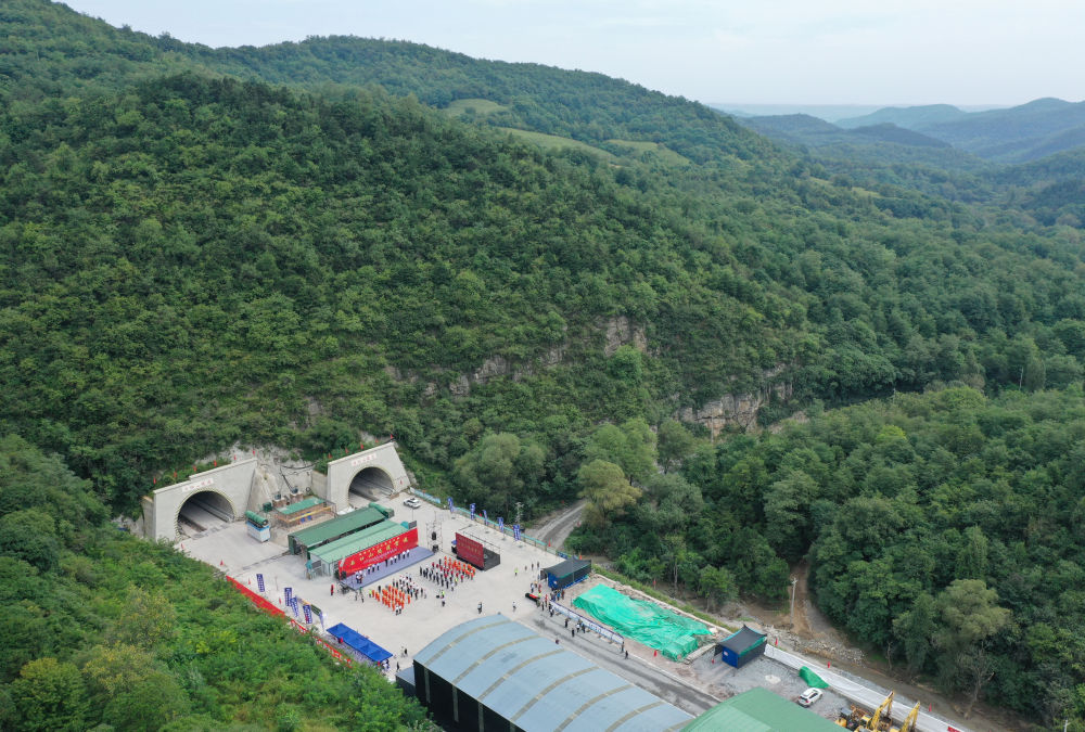 ↑這是位于陜西省寶雞市麟游縣的麟法高速石臼山隧道(無人機(jī)照片,9月1日攝)。