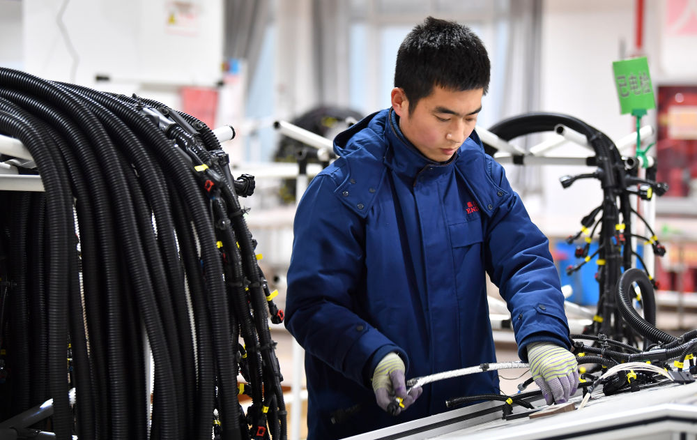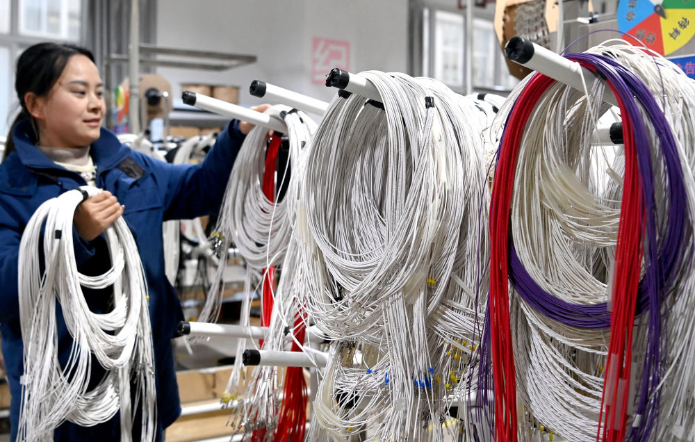 2月20日,在位于陜西省寶雞市隴縣蘇陜工業(yè)園區(qū)的陜西恩達(dá)科技有限公司,工作人員在制作車用線束。新華社記者 劉瀟 攝