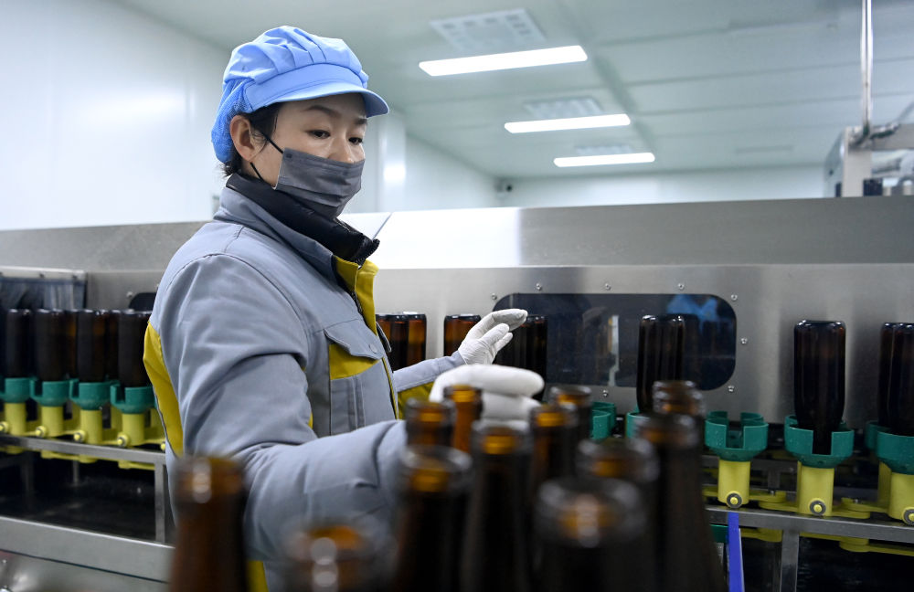 2月20日,在位于陜西省寶雞市隴縣蘇陜工業(yè)園區(qū)的陜西花田隴上釀造科技有限公司,工作人員在制作米酒。新華社記者 劉瀟 攝