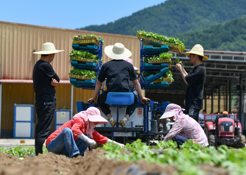 6月24日,在太白縣咀頭鎮(zhèn)一處高山蔬菜田里,農戶在栽種蔬菜苗。新華社記者 蔡湘鑫 攝