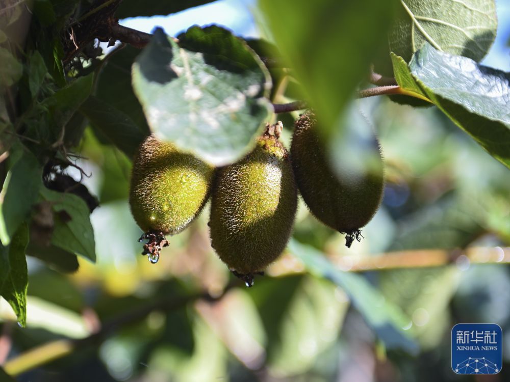 ↑ 6月24日在陜西省眉縣橫渠鎮(zhèn)拍攝的經(jīng)自動噴灌裝置噴灌后的獼猴桃。新華社記者 蔡湘鑫 攝