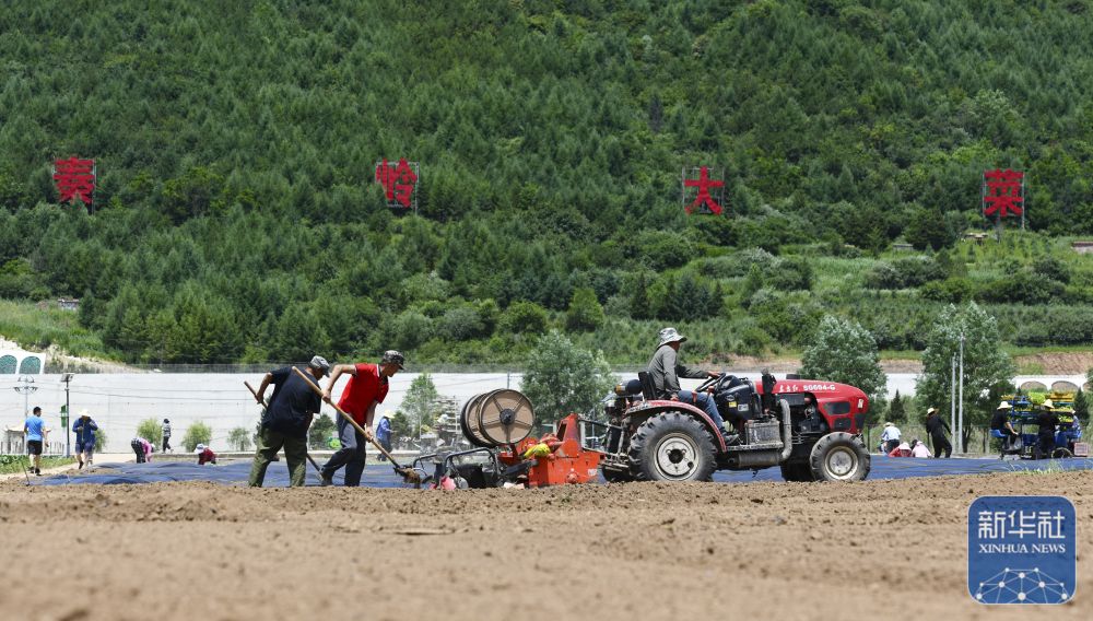 ↑ 6月24日,在陜西省太白縣咀頭鎮(zhèn)一處高山蔬菜田里,農(nóng)戶往剛覆好的地膜上蓋土。新華社記者 蔡湘鑫 攝