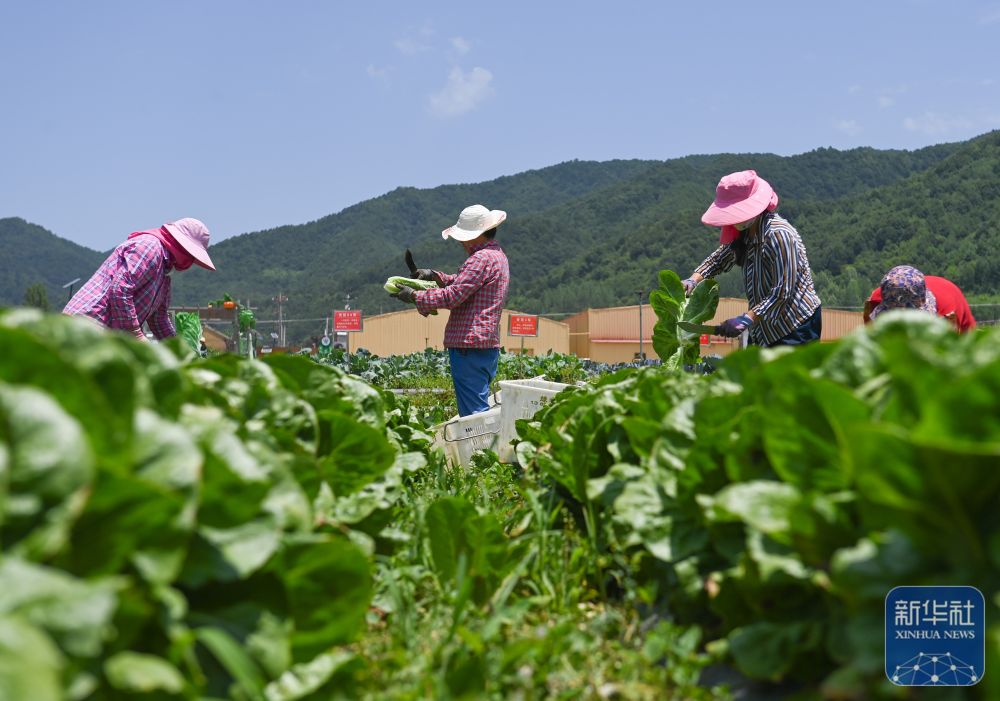 ↑ 6月24日,在陜西省太白縣咀頭鎮(zhèn)一處高山蔬菜田里,農(nóng)戶在采摘生菜。新華社記者 蔡湘鑫 攝
