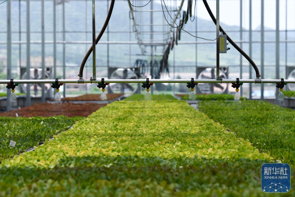↑ 6月24日,在陜西省太白縣咀頭鎮(zhèn)一處蔬菜育苗大棚里,自動噴灌裝置在給蔬菜苗澆水。新華社記者 蔡湘鑫 攝