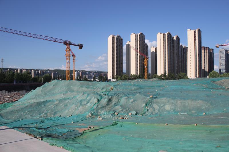 寶雞高新區中華石鼓園一工地旁密網遮蓋、灑水降塵、霧化噴淋等多種措施讓工地不再塵土飛揚。