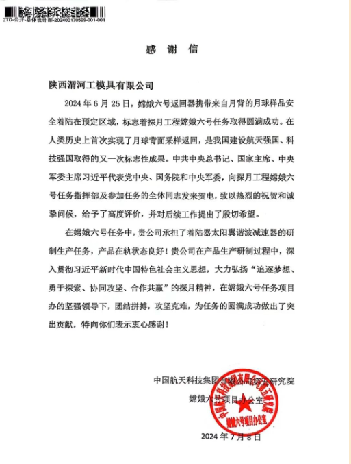 感謝信中提到,在嫦娥六號任務中,陜西渭河工模具有限公司承擔了著陸器太陽翼諧波減速器的研制生產任務,產品在軌狀態良好。陜西渭河工模具有限公司在產品生產研制過程中,深入貫徹習近平新時代中國特色社會主義思想,大力弘揚“追逐夢想、勇于探索、協同攻堅、合作共贏”的探月精神,在嫦娥六號任務項目辦的堅強領導下,團結拼搏,攻堅克難,為任務的圓滿成功做出了突出貢獻。