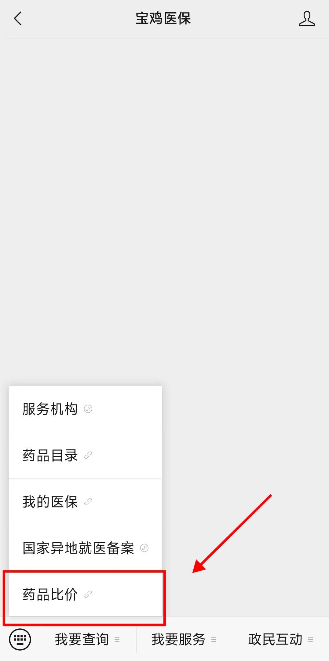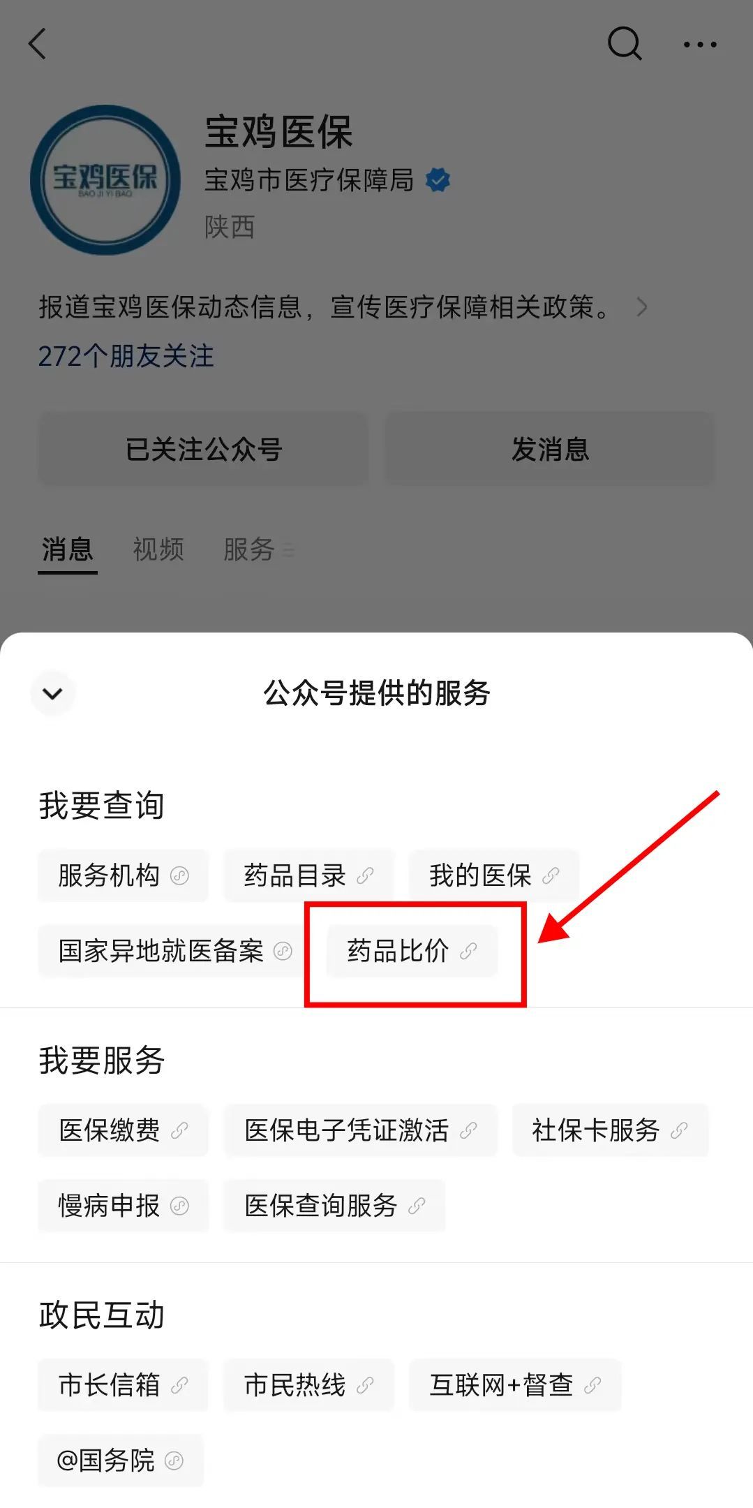 為減輕群眾看病購藥負擔,讓群眾能享受到更加方便優(yōu)質的醫(yī)藥服務,近日,市醫(yī)保局在省局藥品比價功能的基礎上,通過寶雞醫(yī)保公眾號,實現(xiàn)藥品價格在手機上一鍵查詢、實時比對,推動藥品價格更加公開透明。 參保人員進入微信搜索或點擊下方名片關注“寶雞醫(yī)?!?/span>公眾號