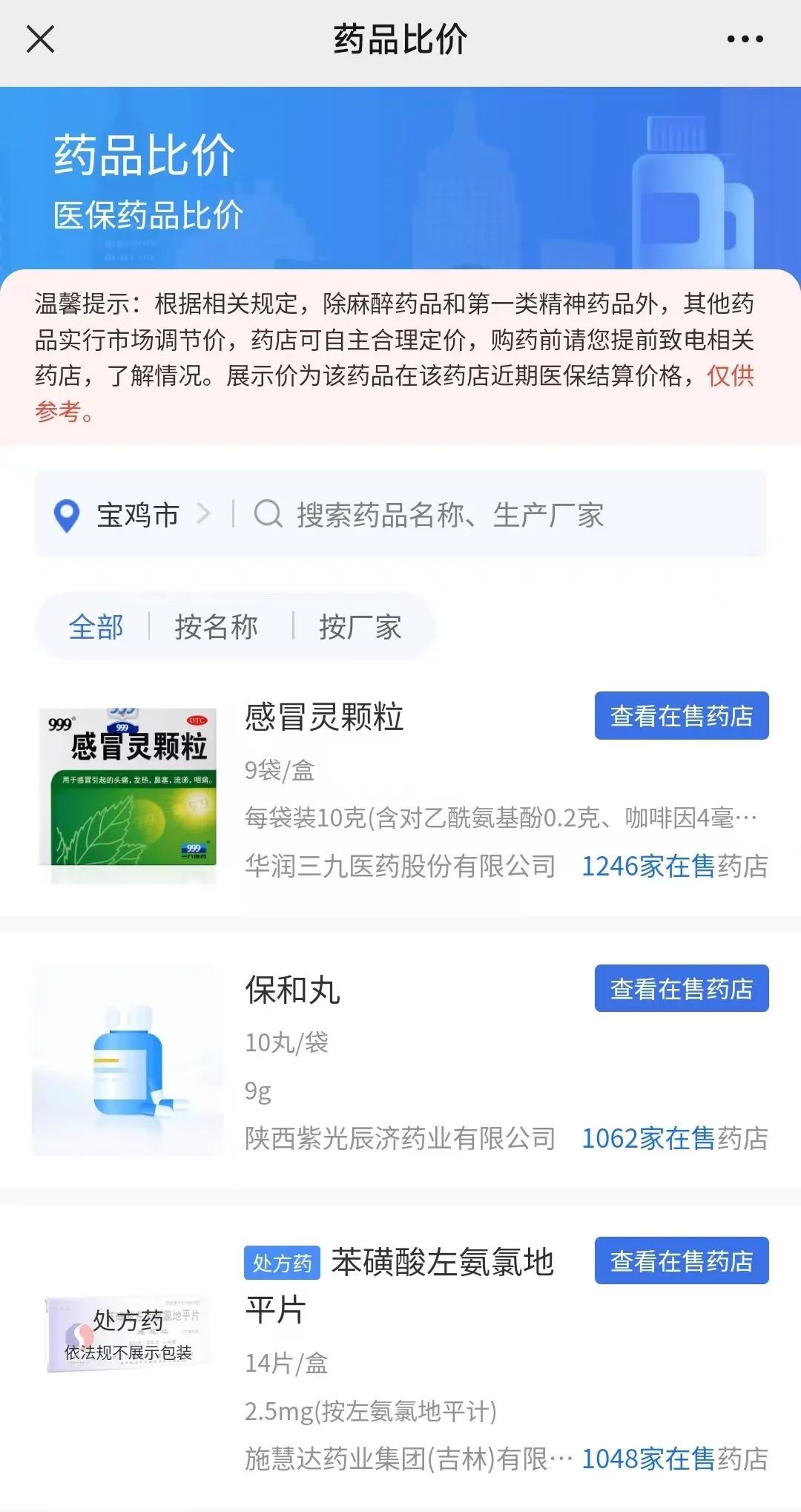 輸入藥品名稱即可查詢到該藥品在全市各定點零售藥店的實際銷售價格。每種藥品按照“距離優(yōu)先”或“價格優(yōu)先”篩選相應零售藥店,并顯示該藥店是否開通“門診統(tǒng)籌”和(或)慢性病醫(yī)保業(yè)務,可以選擇同城乃至省內周邊城市的相同藥品進行比價。