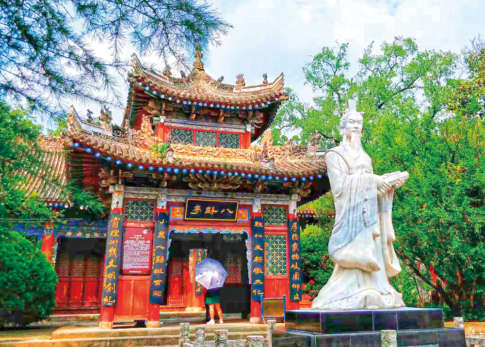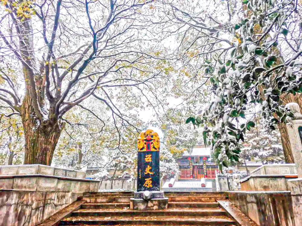 庭院中央,一座漢白玉雕像,頭戴相帽,莊嚴慈祥——這正是周公雕像,往來游客紛紛拍照留影。