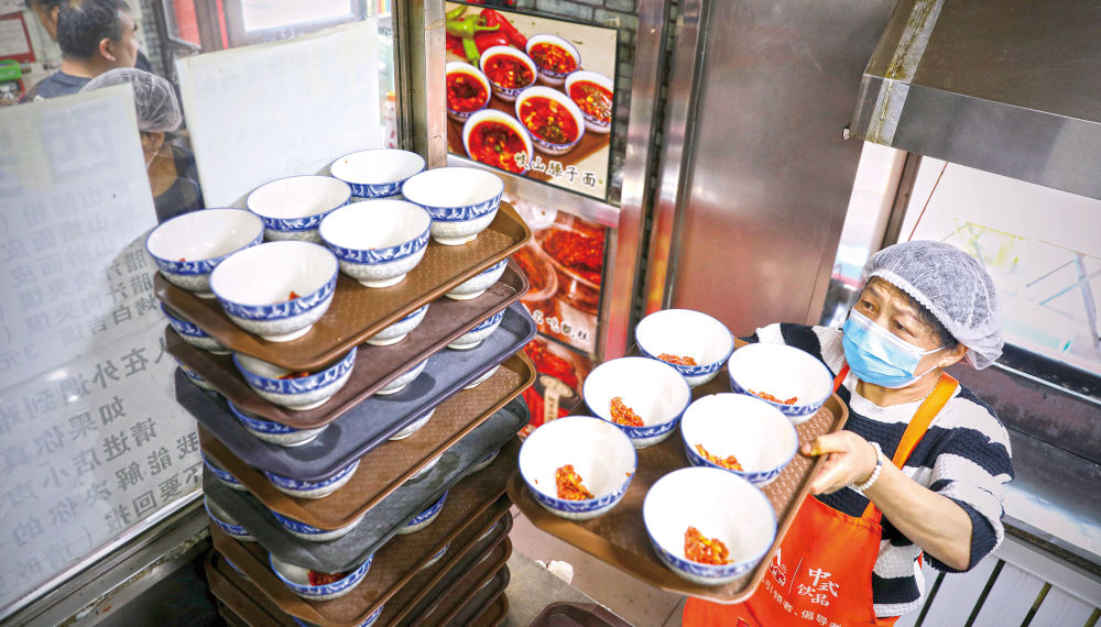 5月1日,一名服務員在后廚擺放好盛好臊子的面碗。新華社記者 姚劍鋒 攝