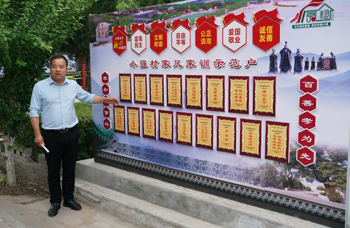 岐山縣京當鎮小強村村口展示的家風家訓示范戶。新華每日電訊記者 邵瑞 攝