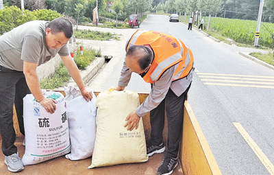 麟游縣農村公路發展服務中心養護工(右)在幫助群眾裝糧食。 楊雅芳攝