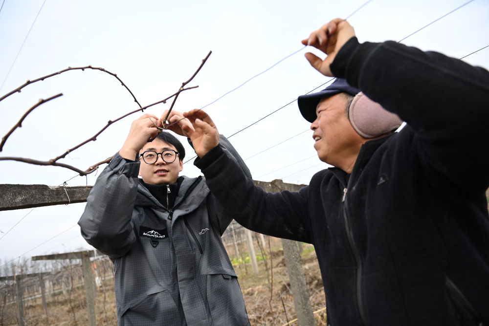 1月4日,陜西省西安市周至縣司竹鎮司竹村黨總支書記助理李同(左)協助果農捆扎獼猴桃果枝。新華社記者 李一博 攝