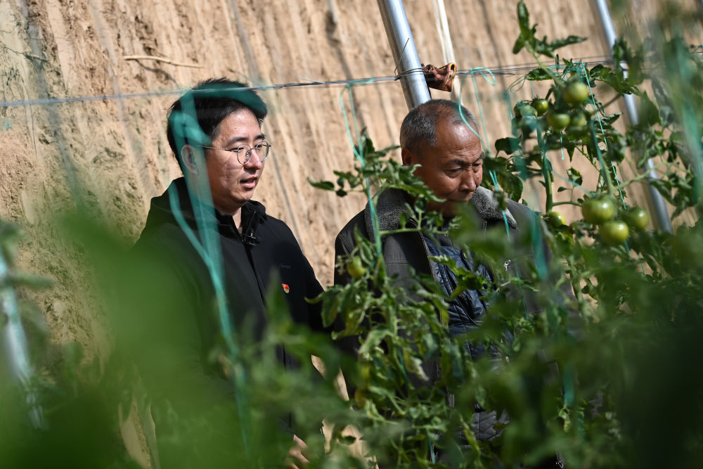 1月9日,陜西省渭南市白水縣雷牙鎮劉家卓村黨總支書記助理、駐村工作隊隊員韓鵬舉(左)在村民的蔬菜大棚里查看西紅柿長勢。新華社記者 李一博 攝