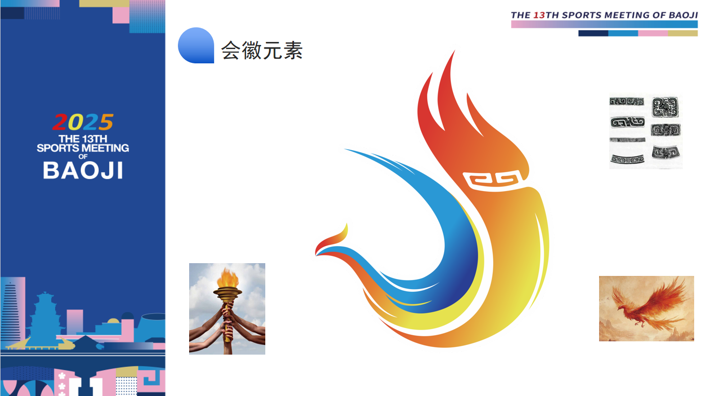 火炬形象象征著運動的熱情與活力,其流暢的線條、充滿動感的設計,展現出運動員奮發向前的姿態。青銅器符文的加入不僅體現了寶雞是中國青銅器之鄉,更彰顯了寶雞人民堅韌不拔、勇于創新的精神。色彩上,運用紅、黃、藍三色漸變,紅色象征熱情活力,黃色代表陽光希望,藍色寓意廣闊天空和海洋,三色交織體現了運動會的多元性,也傳達出寶雞這座城市的包容與開放。