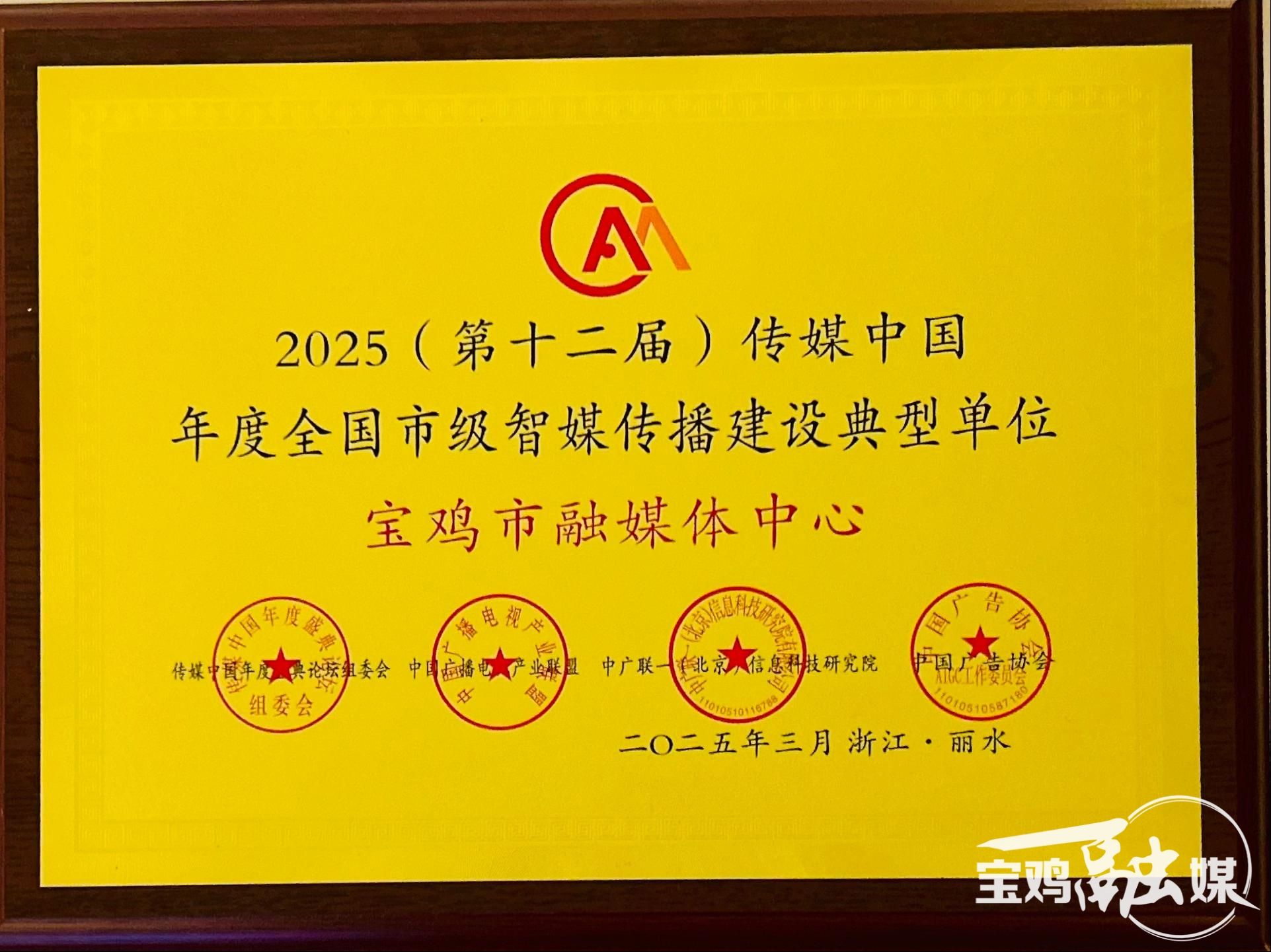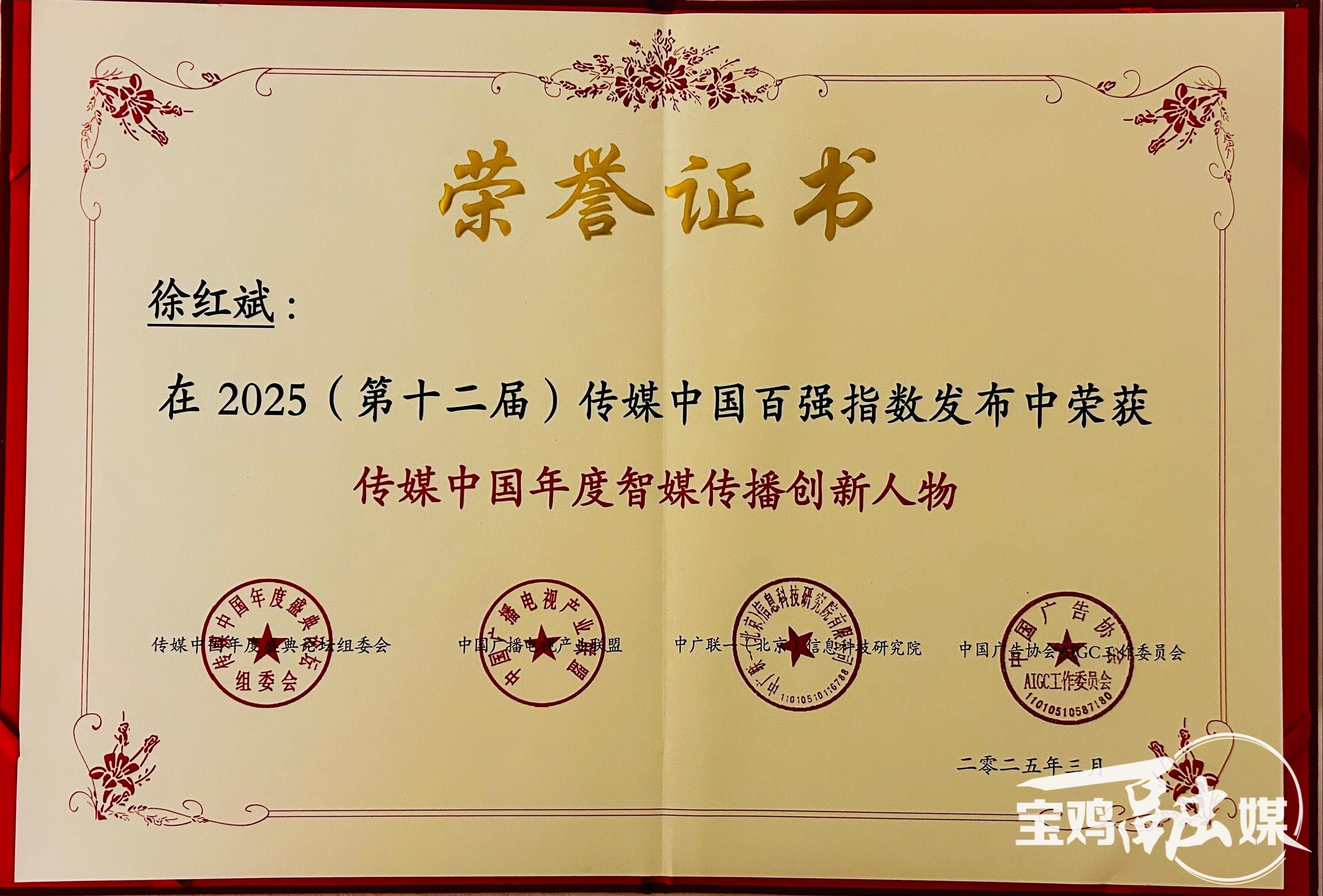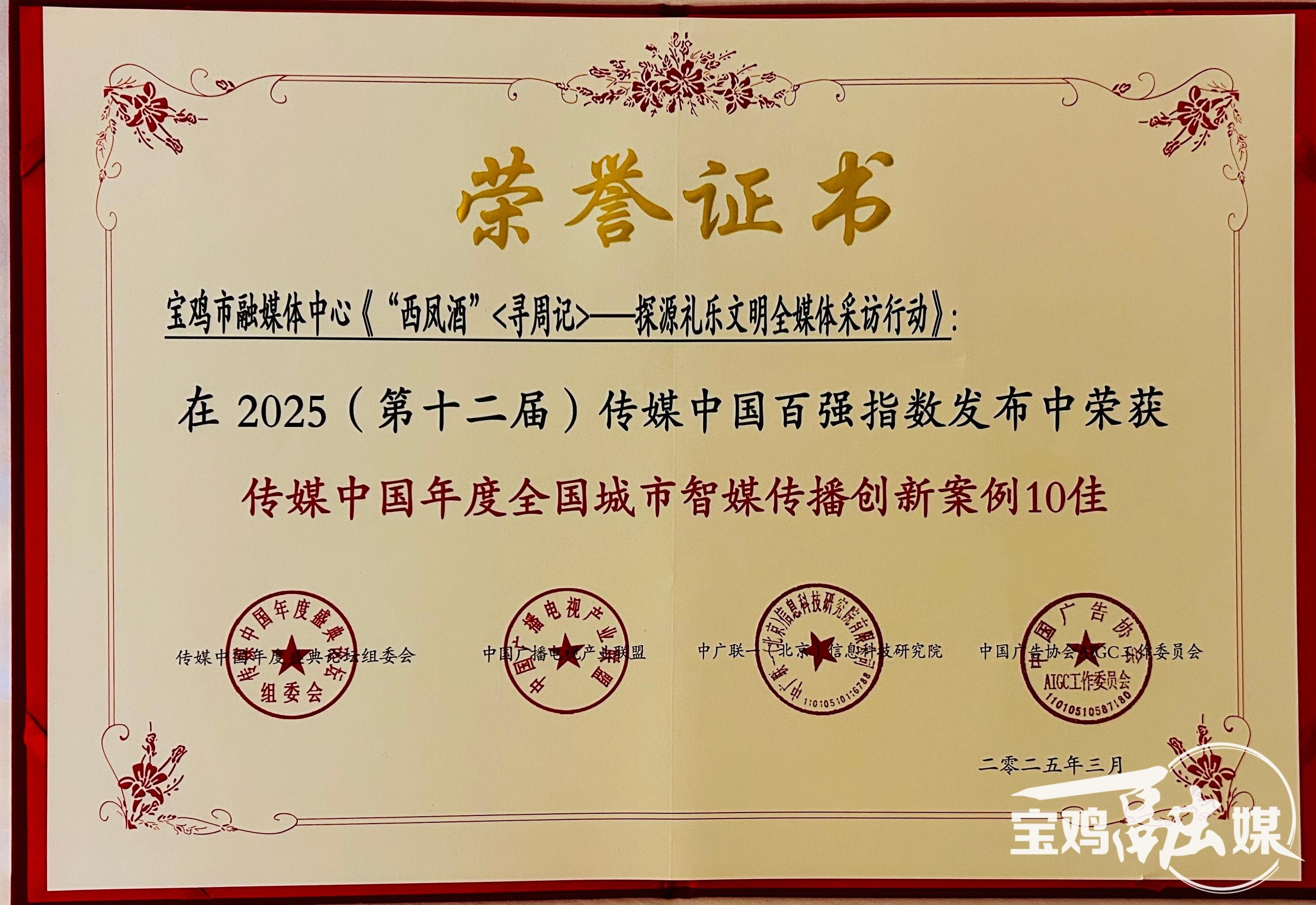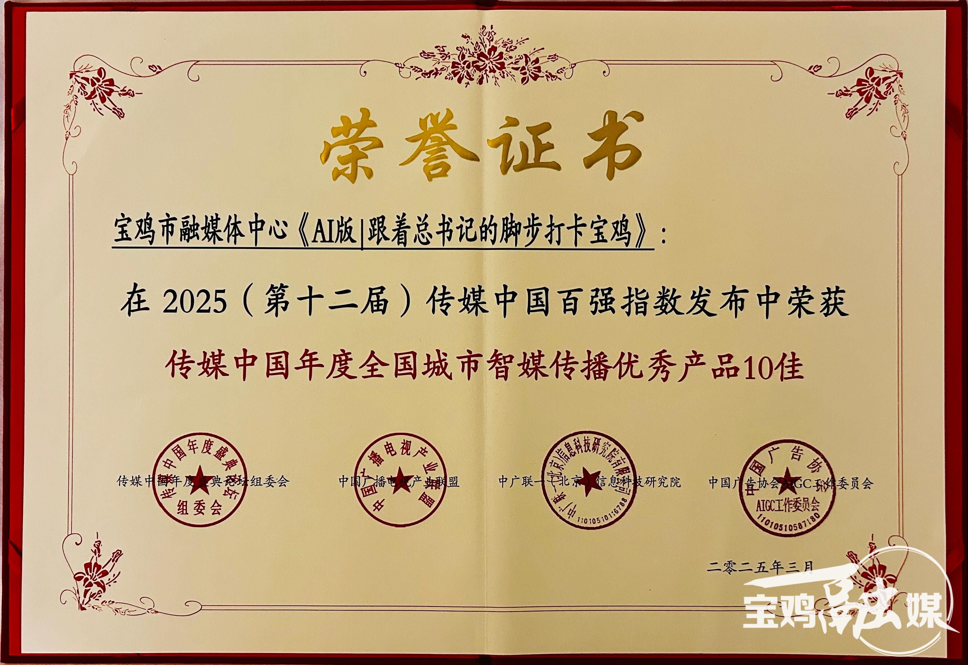 (寶雞融媒 周淑麗)3月31日,從在浙江麗水舉行的“2025(第十二屆)傳媒中國年度盛典暨百強指數發布會”上傳來喜訊:寶雞市融媒體中心入圍傳媒中國年度全國市級智媒傳播建設典型單位;《AI版︱跟著總書記的腳步打卡寶雞》入圍傳媒中國年度城市智媒傳播產品(欄目)10佳;《“西鳳酒”〈尋周記〉——探源禮樂文明全媒體采訪行動》入圍傳媒中國年度城市智媒傳播創新案例10佳;寶雞市融媒體中心黨委書記徐紅斌入圍傳媒中國年度智媒傳播創新人物。