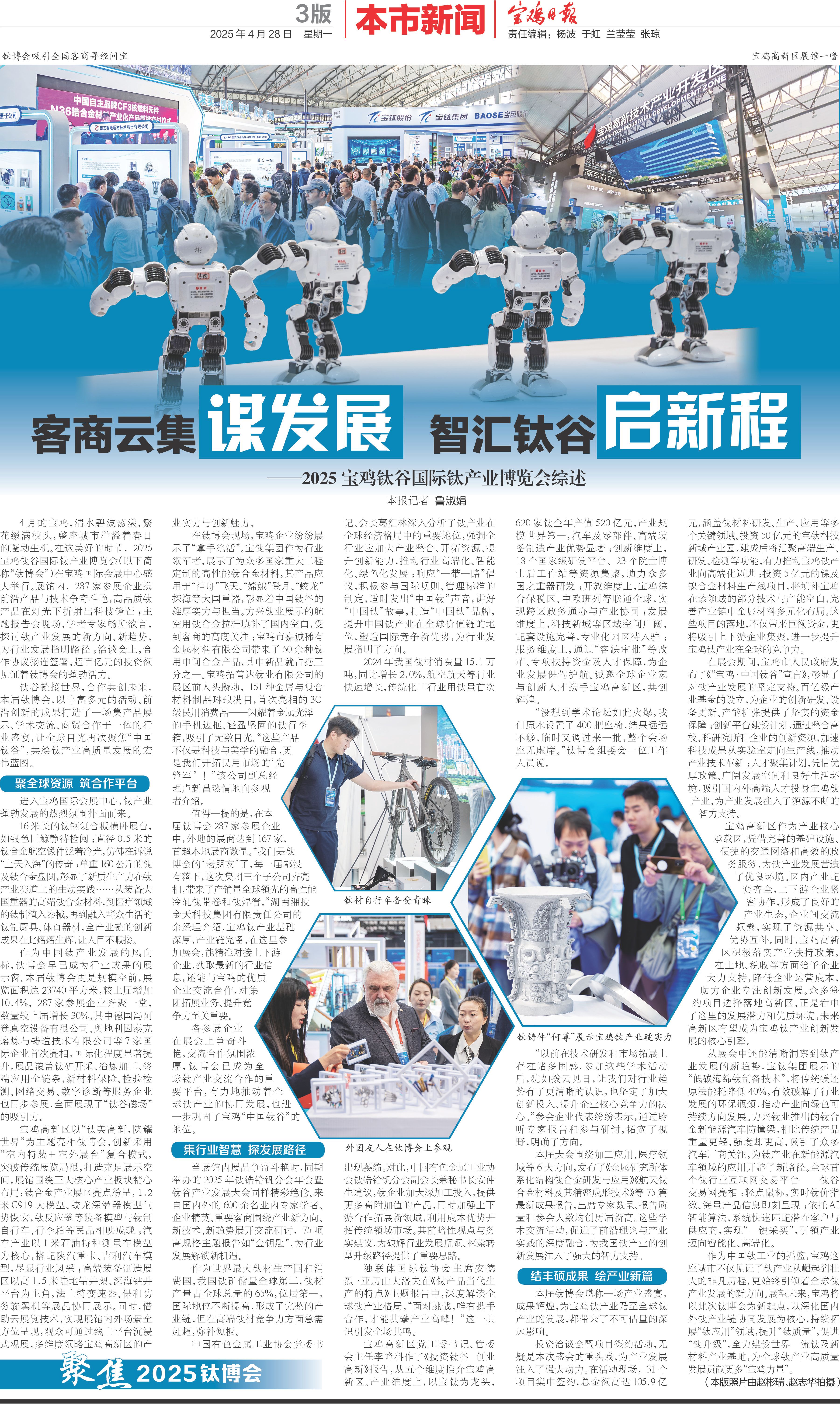 4月的寶雞,渭水碧波蕩漾,繁花綴滿枝頭,整座城市洋溢著春日的蓬勃生機。在這美好的時節,2025寶雞鈦谷國際鈦產業博覽會(以下簡稱“鈦博會”)在寶雞國際會展中心盛大舉行。展館內,287家參展企業攜前沿產品與技術爭奇斗艷,高品質鈦產品在燈光下折射出科技鋒芒;主題報告會現場,學者專家暢所欲言,探討鈦產業發展的新方向、新趨勢,為行業發展指明路徑;洽談會上,合作協議接連簽署,超百億元的投資額見證著鈦博會的蓬勃活力。