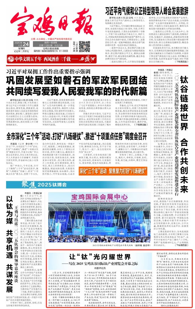 23日至26日,為期四天的這場“鈦”極對話,正在為全球先進材料產業的未來寫下新的注腳。作為鈦博會永久會址和全省鈦及鈦合金產業的主要承載地,寶雞將牢記習近平總書記把實體經濟特別是制造業做實做強做優的重要指示精神,圍繞建設世界鈦都·中國鈦谷的目標,以更加開放的視野深挖鈦潛力,以更加創新的思維拓展鈦應用,以更加融合的姿態促進鈦升級,加快推動鈦及新材料產業高端化、智能化、綠色化發展,助力全省先進制造萬億級產業集群建設再上新臺階。我們相信,當“中國鈦谷”以開放之姿鏈接世界,鈦產業的未來,必將在合作中綻放更璀璨的光芒。