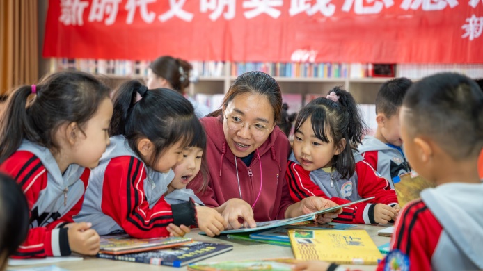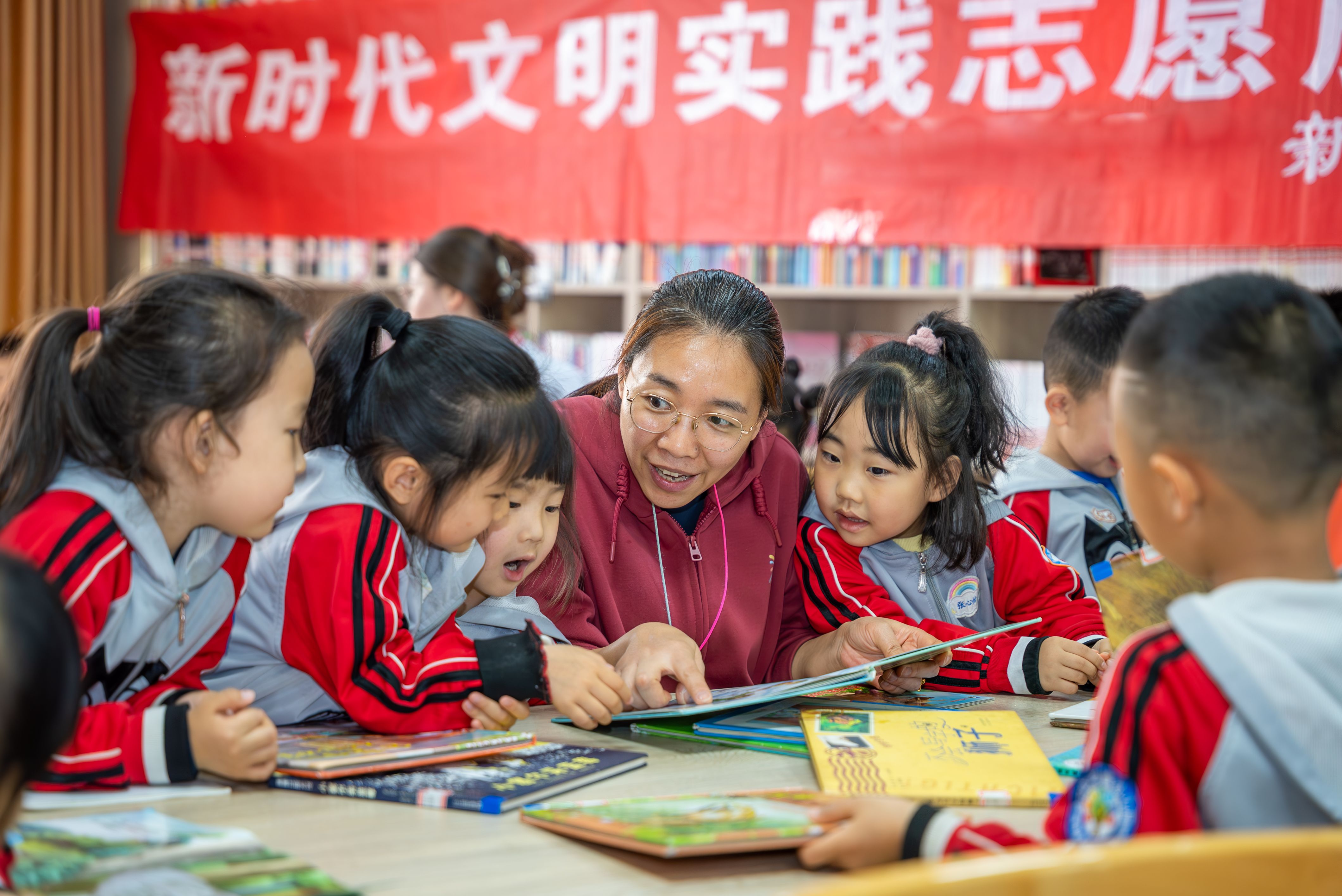 志愿者帶領寶雞高新第一幼兒園的孩子們閱讀兒童繪本