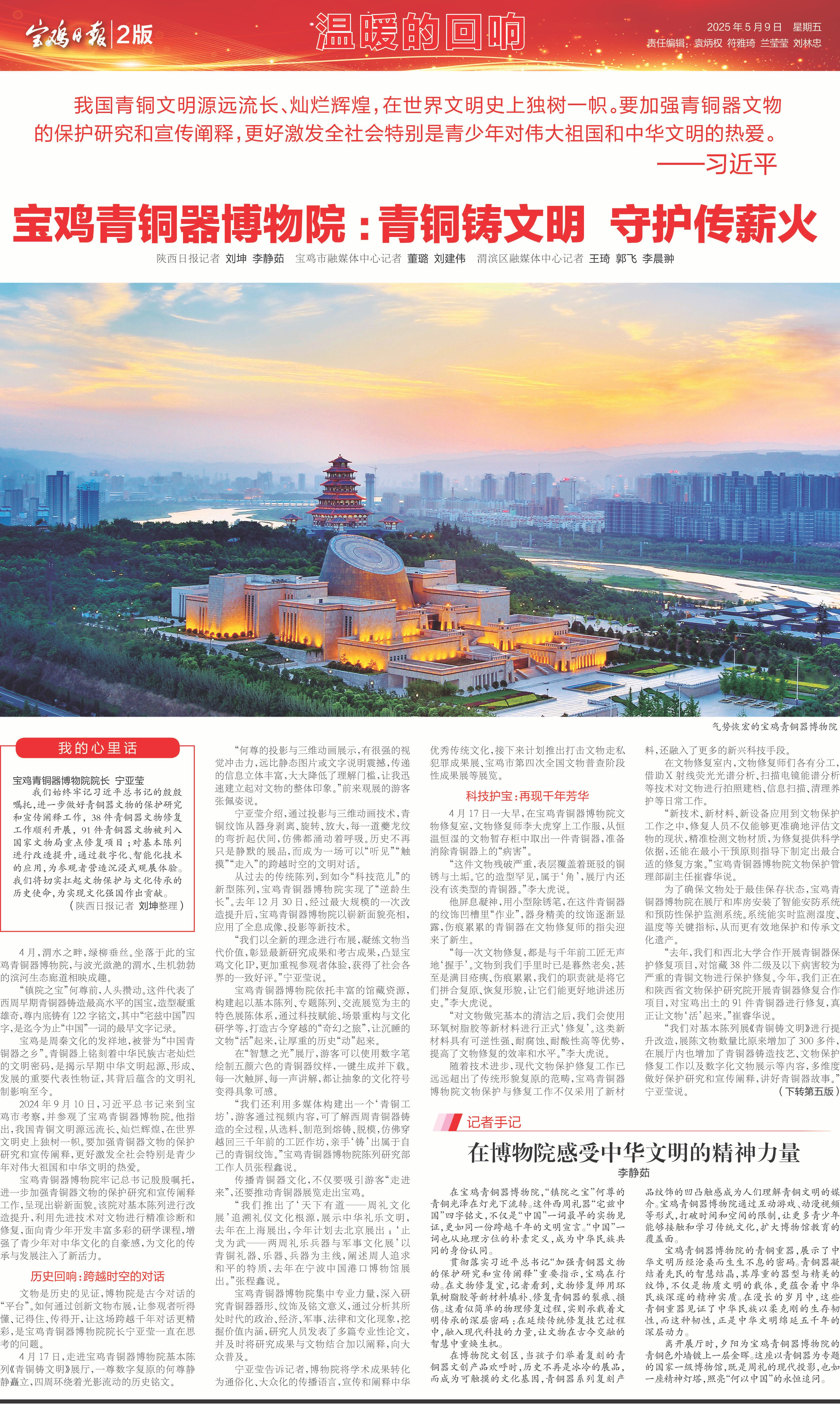 寶雞青銅器博物院牢記總書記殷殷囑托,加強青銅器文物的保護研究和宣傳闡釋,呈現出嶄新面貌。該院對基本陳列進行改造提升,利用先進技術對文物進行精準診斷和修復,面向青少年開設豐富多彩的研學課程,增強了青少年對中華文化的自豪感,為文化的傳承與發展注入了新活力。