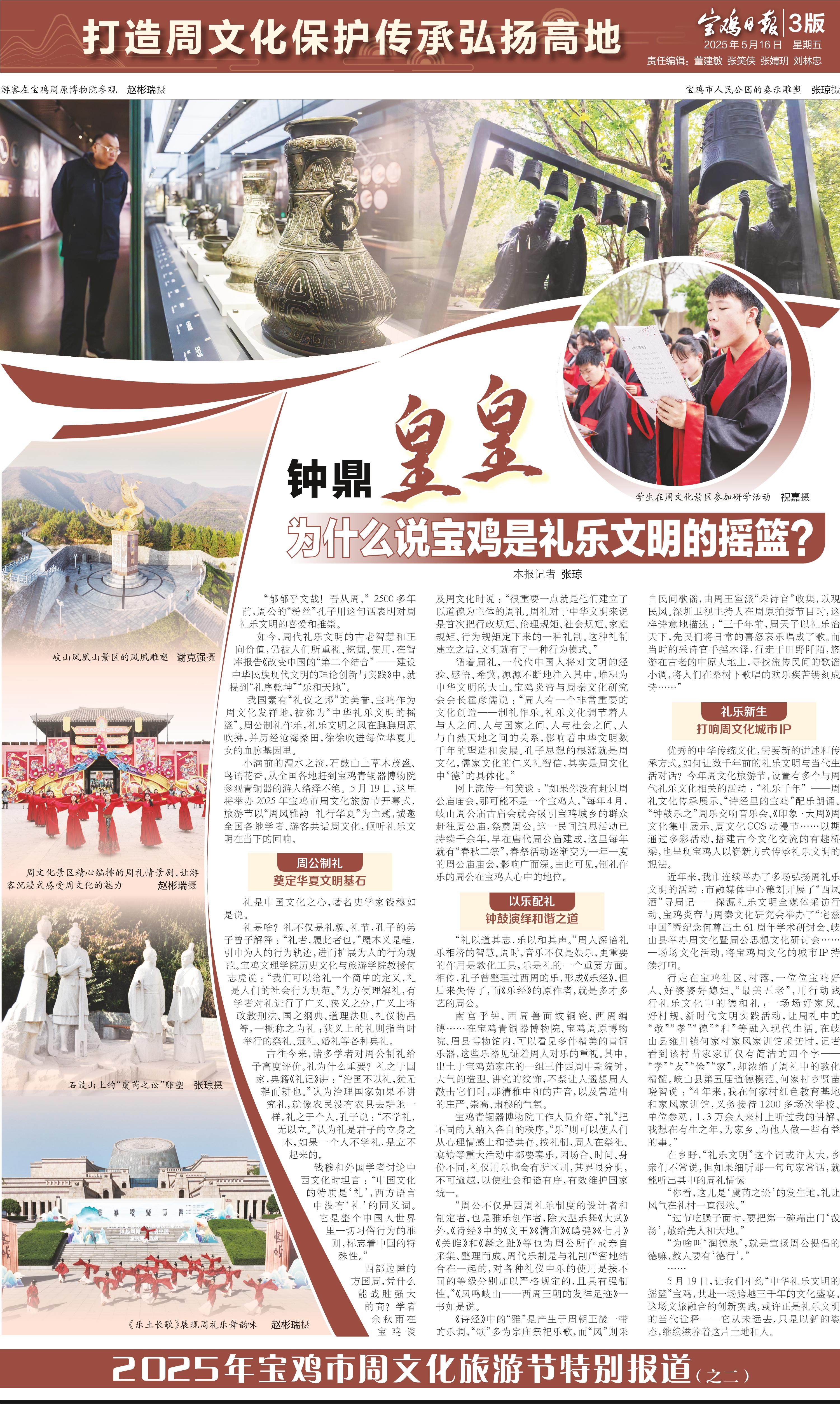 “郁郁乎文哉!吾從周。”2500多年前,周公的“粉絲”孔子用這句話表明對周禮樂文明的喜愛和推崇。 如今,周代禮樂文明的古老智慧和正向價值,仍被人們所重視、挖掘、使用,在智庫報告《改變中國的“第二個結合”——建設中華民族現代文明的理論創新與實踐》中,就提到“禮序乾坤”“樂和天地”。 我國素有“禮儀之邦”的美譽,寶雞作為周文化發祥地,被稱為“中華禮樂文明的搖籃”。周公制禮作樂,禮樂文明之風在膴膴周原吹拂,并歷經滄海桑田,徐徐吹進每位華夏兒女的血脈基因里。 小滿前的渭水之濱,石鼓山上草木茂盛、鳥語花香,從全國各地趕到寶雞青銅器博物院參觀青銅器的游人絡繹不絕。5月19日,這里將舉辦2025年寶雞市周文化旅游節開幕式,旅游節以“周風雅韻 禮行華夏”為主題,誠邀全國各地學者、游客共話周文化,傾聽禮樂文明在當下的回響。 周公制禮 禮是中國文化之心,著名史學家錢穆如是說。 禮是啥?禮不僅是禮貌、禮節,孔子的弟子曾子解釋:“禮者,履此者也。”履本義是鞋,引申為人的行為軌跡,進而擴展為人的行為規范。寶雞文理學院歷史文化與旅游學院教授何志虎說:“我們可以給禮一個簡單的定義,禮是人們的社會行為規范。”為方便理解禮,有學者對禮進行了廣義、狹義之分,廣義上將政教刑法、國之綱典、道理法則、禮儀物品等,一概稱之為禮;狹義上的禮則指當時舉行的祭禮、冠禮、婚禮等各種典禮。 古往今來,諸多學者對周公制禮給予高度評價。禮為什么重要?禮之于國家,典籍《禮記》講:“治國不以禮,猶無耜而耕也。”認為治理國家如果不講究禮,就像農民沒有農具去耕地一樣。禮之于個人,孔子說:“不學禮,無以立。”認為禮是君子的立身之本,如果一個人不學禮,是立不起來的。 錢穆和外國學者討論中西文化時坦言:“中國文化的特質是‘禮’,西方語言中沒有‘禮’的同義詞。它是整個中國人世界里一切習俗行為的準則,標志著中國的特殊性。” 西部邊陲的方國周,憑什么能戰勝強大的商?學者余秋雨在寶雞談及周文化時說:“很重要一點就是他們建立了以道德為主體的周禮。周禮對于中華文明來說是首次把行政規矩、倫理規矩、社會規矩、家庭規矩、行為規矩定下來的一種禮制。這種禮制建立之后,文明就有了一種行為模式。” 循著周禮,一代代中國人將對文明的經驗、感悟、希冀,源源不斷地注入其中,堆積為中華文明的大山。寶雞炎帝與周秦文化研究會會長霍彥儒說:“周人有一個非常重要的文化創造——制禮作樂。禮樂文化調節著人與人之間、人與國家之間、人與社會之間、人與自然天地之間的關系,影響著中華文明數千年的塑造和發展。孔子思想的根源就是周文化,儒家文化的仁義禮智信,其實是周文化中‘德’的具體化。” 網上流傳一句笑談:“如果你沒有趕過周公廟廟會,那可能不是一個寶雞人。”每年4月,岐山周公廟古廟會就會吸引寶雞城鄉的群眾趕往周公廟,祭奠周公。這一民間追思活動已持續千余年,早在唐代周公廟建成,這里每年就有“春秋二祭”,春祭活動逐漸變為一年一度的周公廟廟會,影響廣而深。由此可見,制禮作樂的周公在寶雞人心中的地位。 以樂配禮 “禮以道其志,樂以和其聲。”周人深諳禮樂相濟的智慧。周時,音樂不僅是娛樂,更重要的作用是教化工具,樂是禮的一個重要方面。相傳,孔子曾整理過西周的樂,形成《樂經》,但后來失傳了,而《樂經》的原作者,就是多才多藝的周公。 南宮乎鐘、西周獸面紋銅鐃、西周編镈……在寶雞青銅器博物院、寶雞周原博物院、眉縣博物館內,可以看見多件精美的青銅樂器,這些樂器見證著周人對樂的重視。其中,出土于寶雞茹家莊的一組三件西周中期編鐘,大氣的造型、講究的紋飾,不禁讓人遙想周人敲擊它們時,那清雅中和的聲音,以及營造出的莊嚴、崇高、肅穆的氣氛。 寶雞青銅器博物院工作人員介紹,“禮”把不同的人納入各自的秩序,“樂”則可以使人們從心理情感上和諧共存。按禮制,周人在祭祀、宴饗等重大活動中都要奏樂,因場合、時間、身份不同,禮儀用樂也會有所區別,其界限分明,不可逾越,以使社會和諧有序,有效維護國家統一。 “周公不僅是西周禮樂制度的設計者和制定者,也是雅樂創作者,除大型樂舞《大武》外,《詩經》中的《文王》《清廟》《鴟鸮》《七月》《關雎》和《麟之趾》等也為周公所作或親自采集、整理而成。周代樂制是與禮制嚴密地結合在一起的,對各種禮儀中樂的使用是按不同的等級分別加以嚴格規定的,且具有強制性。”《鳳鳴岐山——西周王朝的發祥足跡》一書如是說。 《詩經》中的“雅”是產生于周朝王畿一帶的樂調,“頌”多為宗廟祭祀樂歌,而“風”則采自民間歌謠,由周王室派“采詩官”收集,以觀民風。深圳衛視主持人在周原拍攝節目時,這樣詩意地描述:“三千年前,周天子以禮樂治天下,先民們將日常的喜怒哀樂唱成了歌。而當時的采詩官手搖木鐸,行走于田野阡陌,悠游在古老的中原大地上,尋找流傳民間的歌謠小調,將人們在桑樹下歌唱的歡樂疾苦鐫刻成詩……” 禮樂新生 優秀的中華傳統文化,需要新的講述和傳承方式。如何讓數千年前的禮樂文明與當代生活對話?今年周文化旅游節,設置有多個與周代禮樂文化相關的活動:“禮樂千年”——周禮文化傳承展示、“