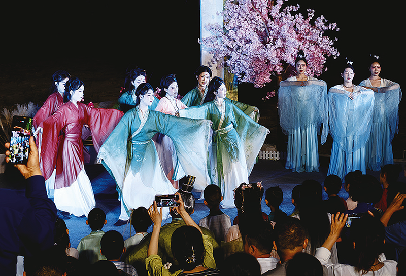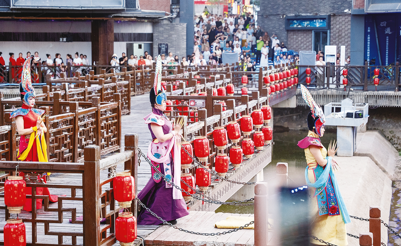 晚上7時,“咚咚咚”的擂鼓聲在廣場響起,“周武王”正了正衣冠,大聲宣告:“開市!”這一刻,所有的“古人”都“活”了過來。伴隨著激昂的音樂,“姜太公”甩起魚竿,舞女們翩翩起舞,將士們舉起長矛和巨盾,護(hù)送著貴族、官員和百姓走向不同的方向。