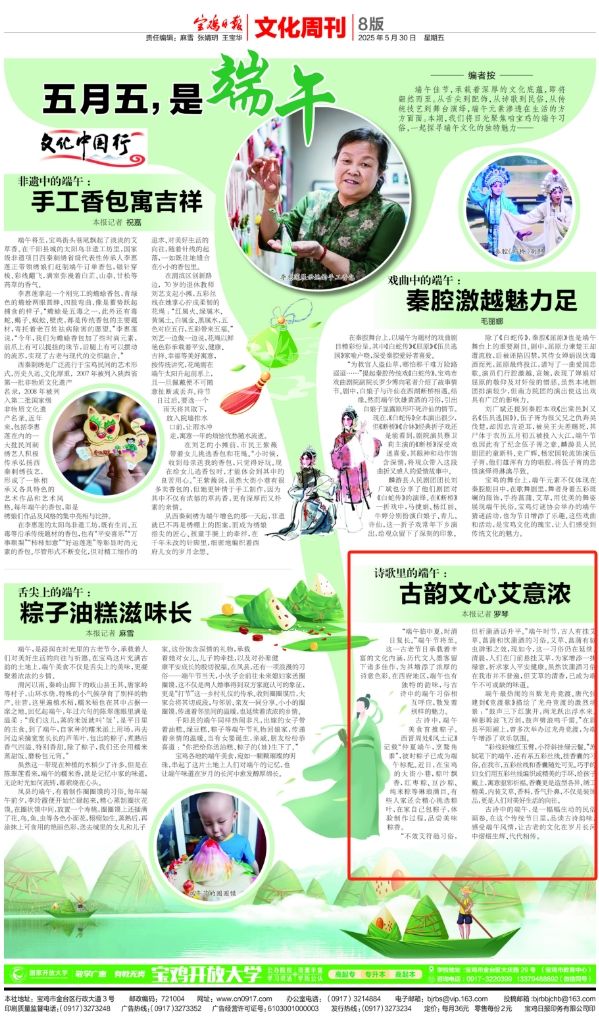(寶雞融媒 羅琴)“端午臨中夏,時清日復長。”端午節將至。這一古老節日承載著豐富的文化內涵,歷代文人墨客留下諸多佳作,為其增添了濃厚的詩意色彩。在西府地區,端午也有獨特的韻味,與古詩中的端午習俗相互呼應,散發著別樣的魅力。