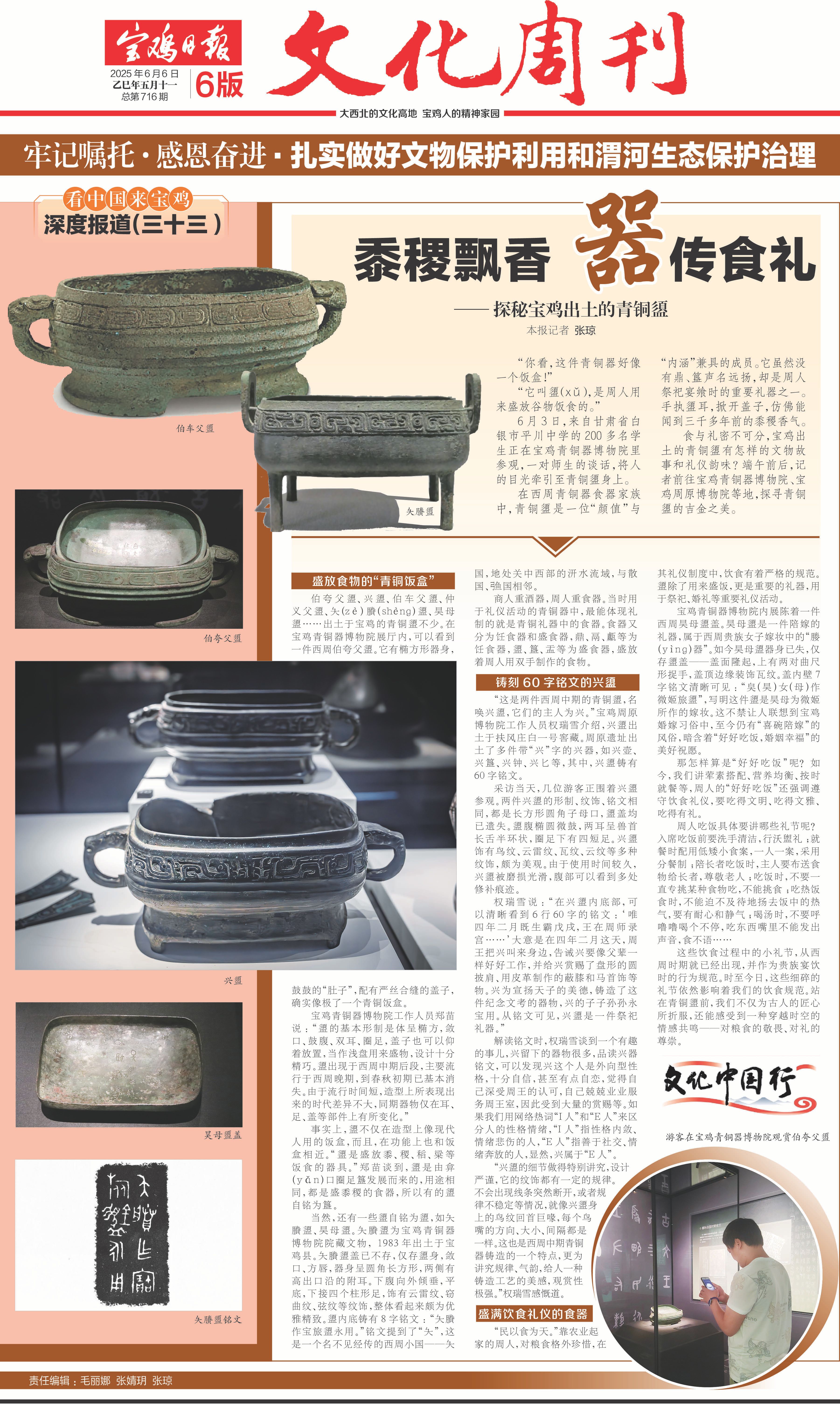 這些飲食過程中的小禮節,從西周時期就已經出現,并作為貴族宴飲時的行為規范。時至今日,這些細碎的禮節依然影響著我們的飲食規范。站在青銅盨前,我們不僅為古人的匠心所折服,還能感受到一種穿越時空的情感共鳴——對糧食的敬畏、對禮的尊崇。(寶雞融媒 張瓊)