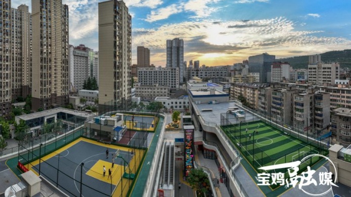 現代設計重構都市生活美學。在渭濱區的文化里商業街,樓頂空間搖身變成空中運動場,強化玻璃防護墻+360°防護網提供安全保障,體現出城市空間的人文關懷與創新融合,讓商業活力與民生福祉共存。