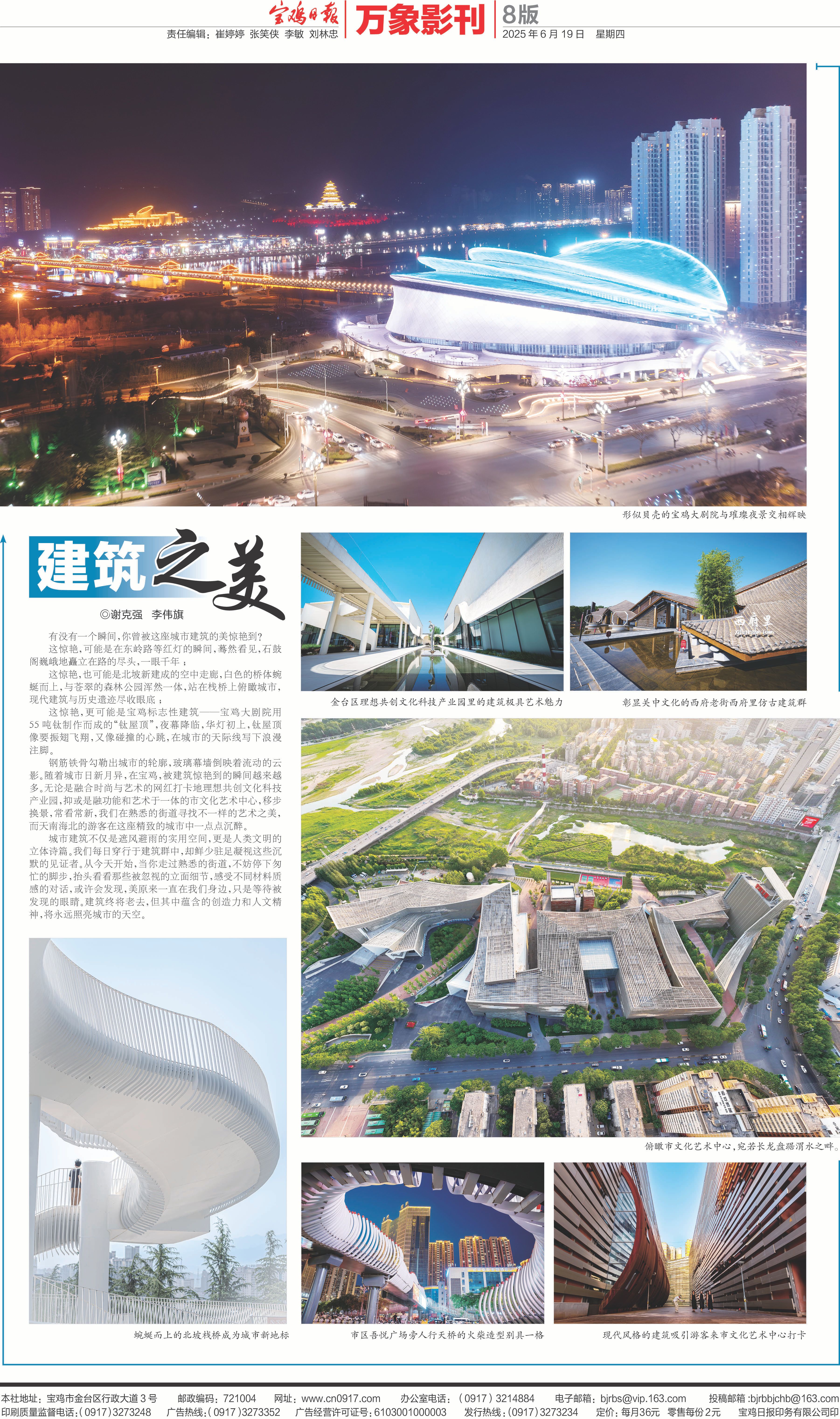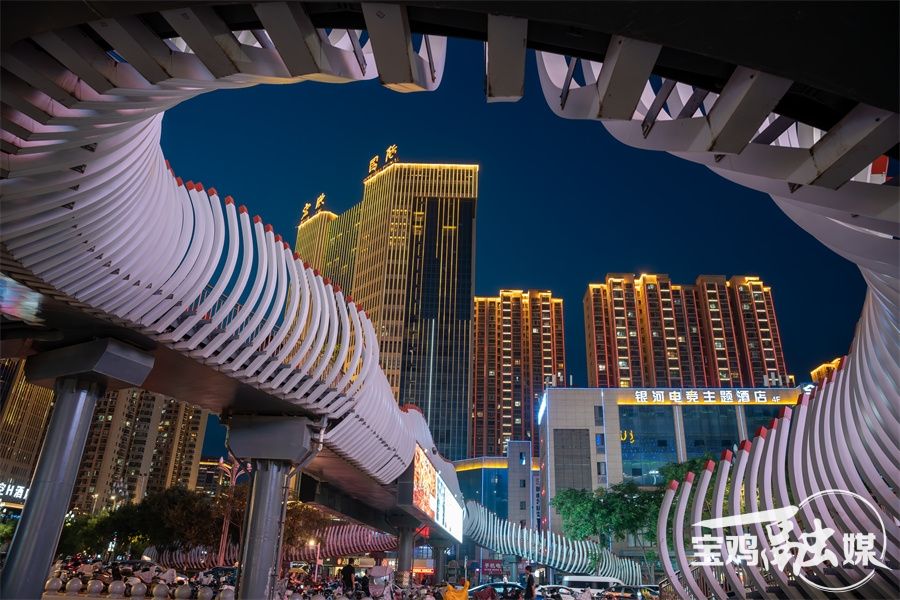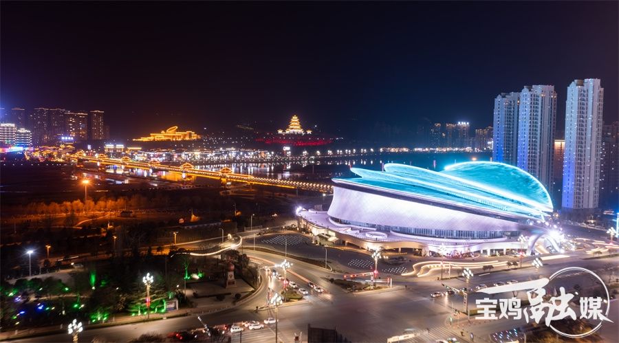 這驚艷,更可能是寶雞標志性建筑——寶雞大劇院用55噸鈦制作而成的“鈦屋頂”,夜幕降臨,華燈初上,鈦屋頂像要振翅飛翔,又像碰撞的心跳,在城市的天際線寫下浪漫注腳。