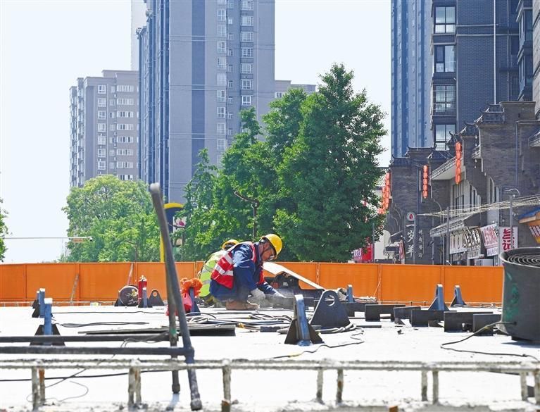 六月十二日,在寶雞市渭濱區石壩河橋建設現場,施工人員在作業。 陜西日報記者 李靜茹攝