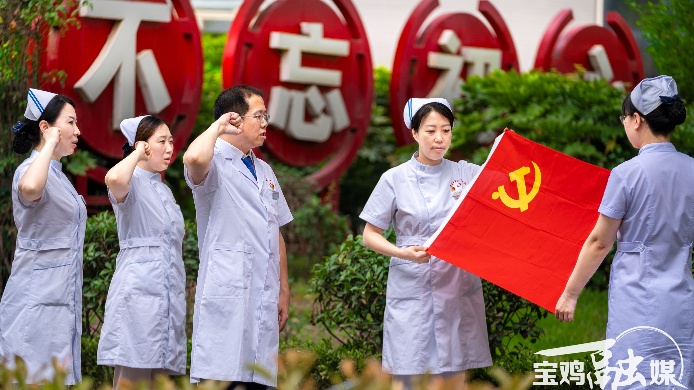 圖為衛健系統優秀共產黨員、寶雞市第二人民醫院泌尿外科主任朱坤軍(左三),帶領科室成員重溫入黨誓詞。