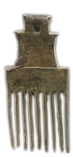 目前,寶雞青銅器博物院館藏青銅梳皆出土于竹園溝(弓魚yu)國墓地。在竹園溝(弓魚yu)國墓地十三號墓中,曾出土兩件銅梳,其中一件較為完整。這件銅梳略大,通高9.6厘米、身寬4.2厘米,梳身頂端部分做成“凸”形,便于用手把握,上部有孔可穿系,銅梳下端為長方形,有9枚長長的梳齒,看起來頗為典雅秀氣。