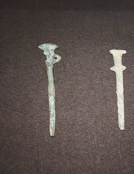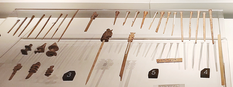 與青銅梳同樣引人注意的是笄,笄的材質不一而足,有銅、木、玉、骨等多種材質。在寶雞青銅器博物院內可以看到多根銅發笄,在寶雞周原博物院則能欣賞到許多骨笄,周原遺址出土的完殘骨笄數以千計,尤其是云塘制骨作坊有大量骨笄出土。