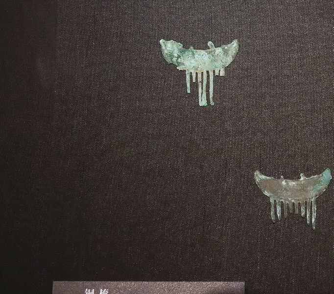 這兩件梳子堪稱“袖珍青銅梳”,僅半掌般大小,一件殘高4.4厘米、寬5.4厘米,另一件殘高5.4厘米、寬5.7厘米。兩梳頂中部都有半圓環鈕,8枚梳齒,其中一梳的梳齒近半數殘缺。