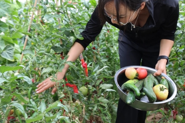 村民在“庭前小院”采摘時令蔬菜。(王國強 攝)
