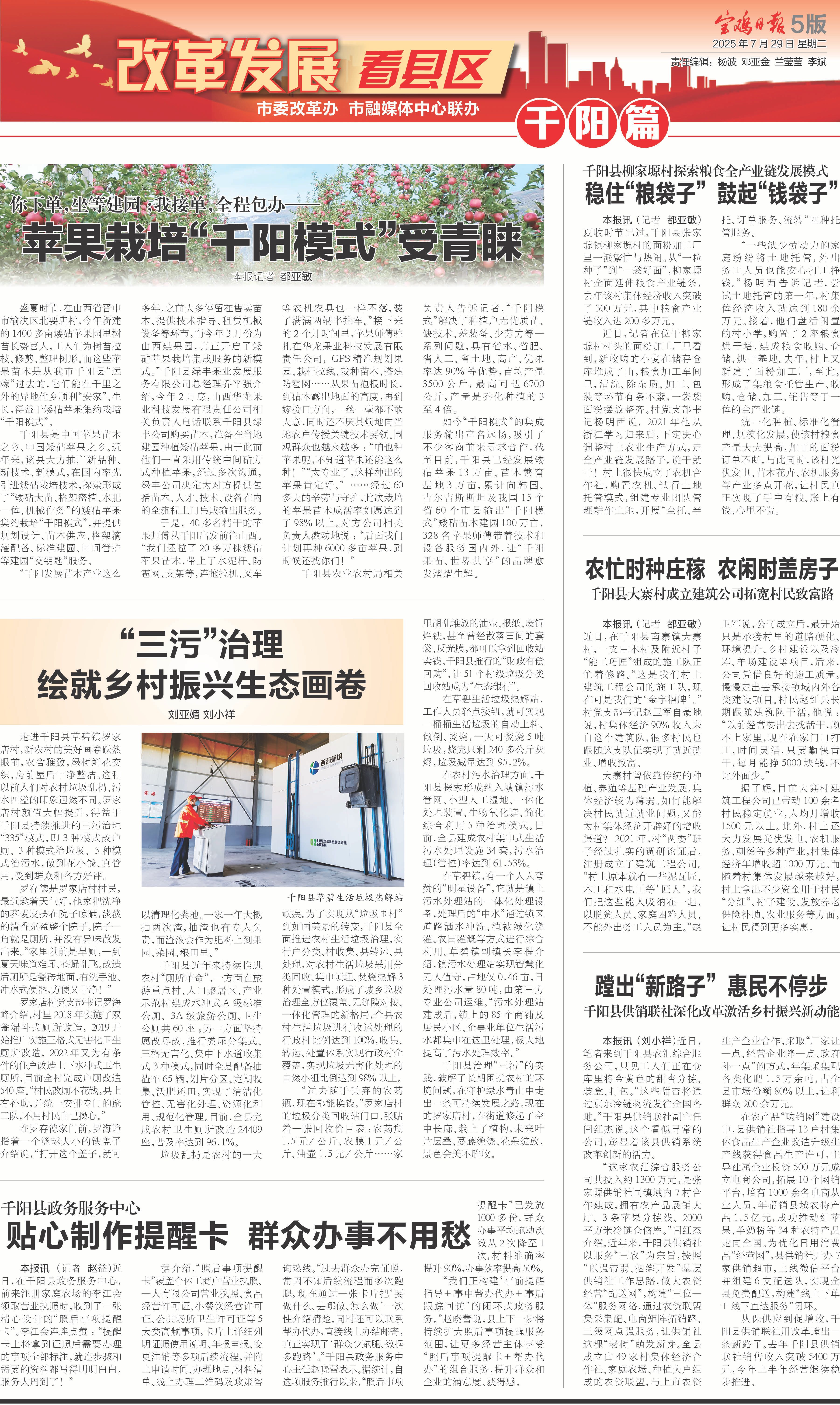 千陽縣是中國蘋果苗木之鄉、中國矮砧蘋果之鄉。近年來,該縣大力推廣新品種、新技術、新模式,在國內率先引進矮砧栽培技術,探索形成了“矮砧大苗、格架密植、水肥一體、機械作務”的矮砧蘋果集約栽培“千陽模式”,并提供規劃設計、苗木供應、格架滴灌配備、標準建園、田間管護等建園“交鑰匙”服務。