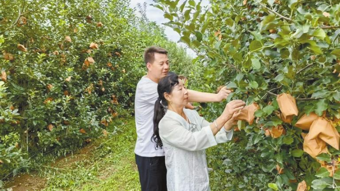 7月23日,韓英杰(左)在蘋果園里指導群眾管護果樹。陜西日報記者 李靜茹攝