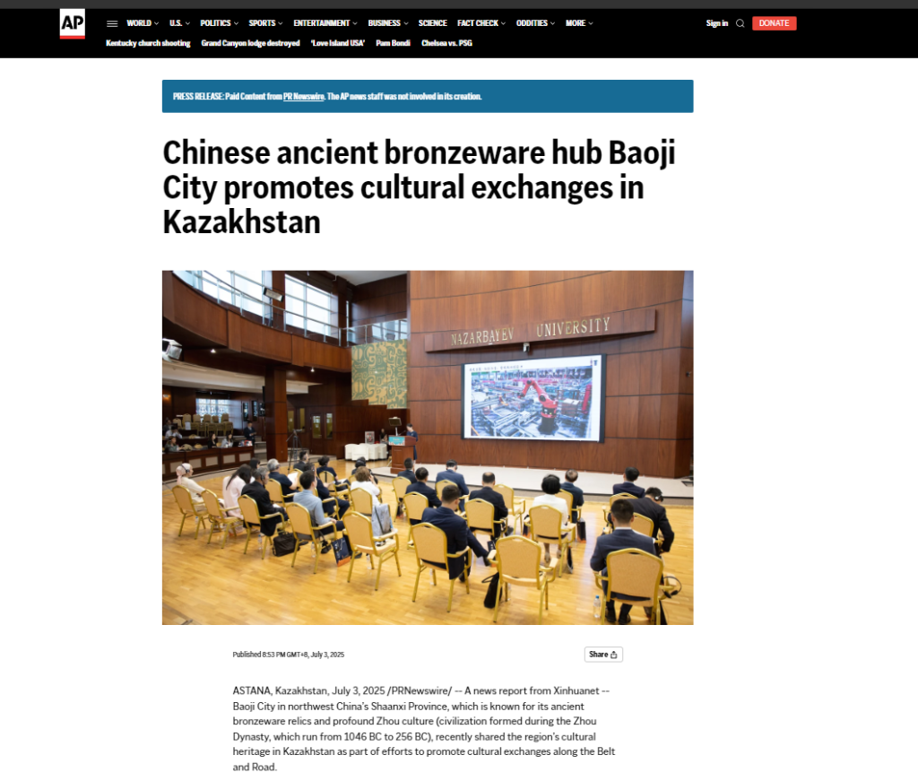 在歐洲,西班牙 Europa Press 解讀周文化與哈薩克斯坦文明的共性,荷蘭ANP向歐洲受眾傳遞活動內涵,共有110家媒體關注中國青銅器與哈薩克金人的文明互鑒活動。德國知名財經網站FinanzNachrichten.de在報道中指出,此次活動為世界了解中華周文化打開一扇窗,展示了中國寶雞深厚的周文化底蘊和“青銅器之鄉”的獨特魅力。