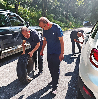 正在他們一籌莫展時,陜西省太白林業局黃柏塬林場職工方永芳、武建忠、李衛群三人恰巧駕車經過,看到有人在路邊尋求幫助,立即停車詢問,在確認車輛狀況后,迅速從車上取出千斤頂等工具開始更換輪胎。烈日當空,三名好心人的汗水很快浸透衣衫。30分鐘后,輪胎更換完畢。“備胎氣壓要時刻注意,車速不要太快。”臨別前,方永芳等人反復叮囑并詳細告知修理廠方位。當曾女士表示感謝時,他們擺手笑道 :“我們常年巡護這條路,誰遇到困難都會搭把手,這不算啥。”