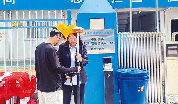 8月4日10時,地表溫度持續上升,陳倉區千河鎮中國供銷(寶雞)農批城項目一期工地上熱浪蒸騰。測繪隊員韓艷榮和姜儀頭戴安全帽、肩扛全站儀,在毫無遮擋的水泥地面上來回穿梭。烈日下,金屬儀器外殼發燙,他們的工作服早已被汗水浸透。“高溫會導致儀器參數微變,我們必須反復校準儀器,數據差1毫米都可能影響工程質量。”韓艷榮說。為應對高溫“烤”驗,市不動產登記中心權籍調查科不僅調整了工作人員的作業時間,還為他們配備了防曬冰袖、清涼油等物資,并安排專人配送綠豆湯等。