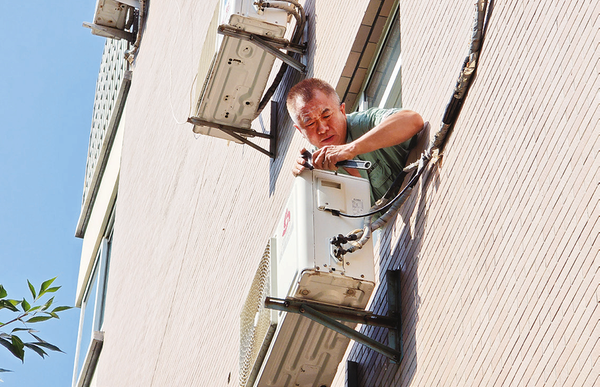 8月12日10時,筆者在金臺區祥瑞花園小區3號樓一戶居民家中見到了劉建民。只見他腰間系著安全繩,將大半個身子探出窗外,把一臺沉重的空調外機緩緩地挪進屋?!斑@是移機作業,相對簡單。上個月有一天天氣炎熱,為修好一臺中央空調,我在樓頂平臺忙活了3個多小時?!眲⒔竦皖^邊擰著外機螺絲邊說,藍色工裝的后背上已洇出大片鹽漬。