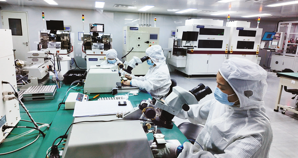 在麥克傳感器股份有限公司,工作人員進行傳感器超精度焊接。