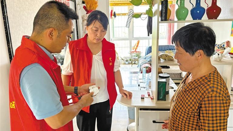 八月十四日,寶雞市陳倉區周原鎮周原街道社區的社區工作者為老齡居民上門安裝“閃光門鈴”。