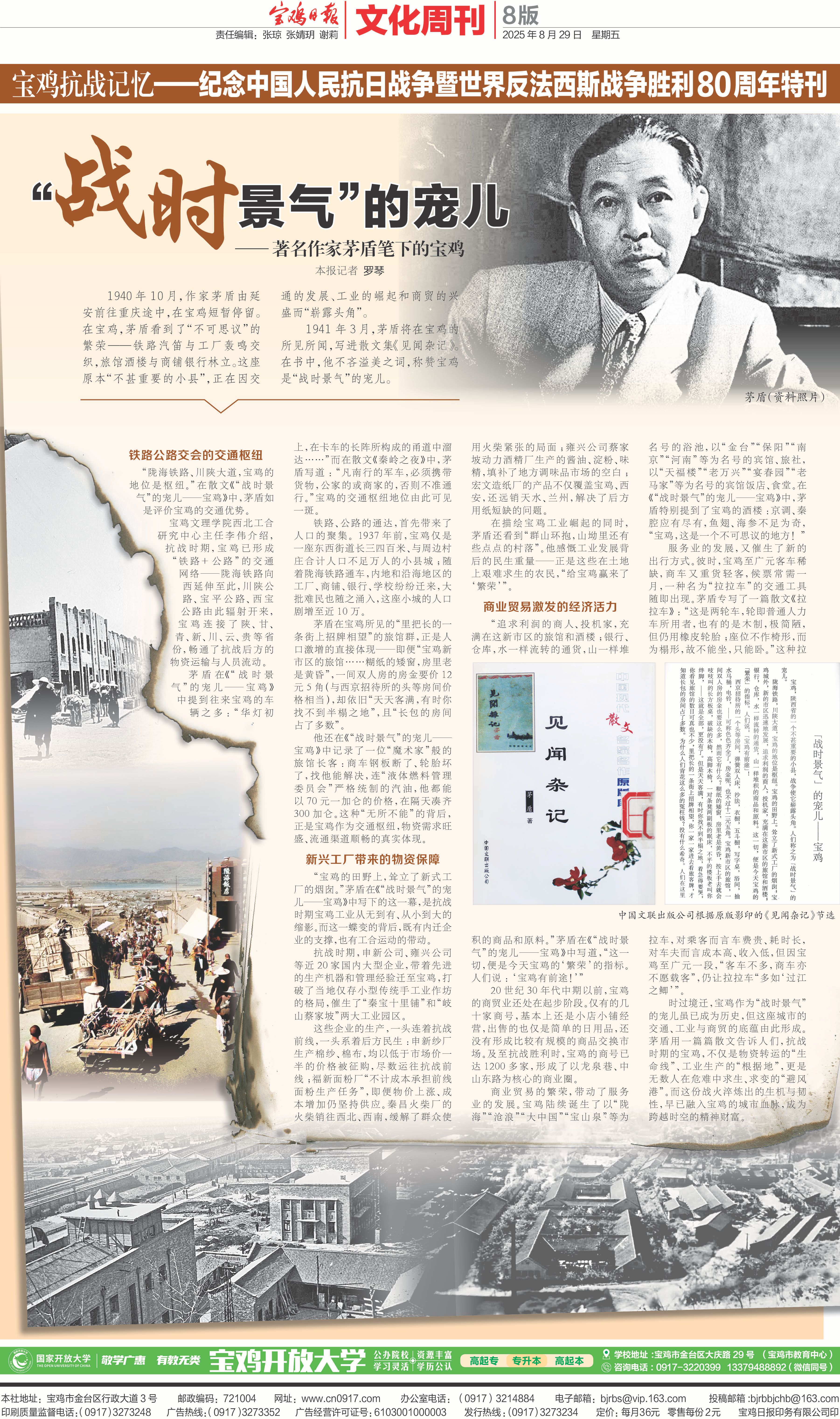 時過境遷,寶雞作為“戰(zhàn)時景氣”的寵兒雖已成為歷史,但這座城市的交通、工業(yè)與商貿(mào)的底蘊由此形成。茅盾用一篇篇散文告訴人們,抗戰(zhàn)時期的寶雞,不僅是物資轉(zhuǎn)運的“生命線”、工業(yè)生產(chǎn)的“根據(jù)地”,更是無數(shù)人在危難中求生、求變的“避風港”。而這份戰(zhàn)火淬煉出的生機與韌性,早已融入寶雞的城市血脈,成為跨越時空的精神財富。