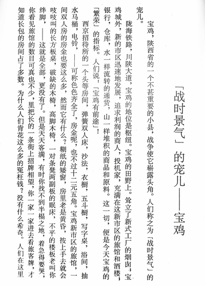 “追求利潤的商人、投機家,充滿在這新市區(qū)的旅館和酒樓;銀行、倉庫,水一樣流轉(zhuǎn)的通貨,山一樣堆積的商品和原料。”茅盾在《“戰(zhàn)時景氣”的寵兒——寶雞》中寫道,“這一切,便是今天寶雞的‘繁榮’的指標。人們說 :‘寶雞有前途!’”