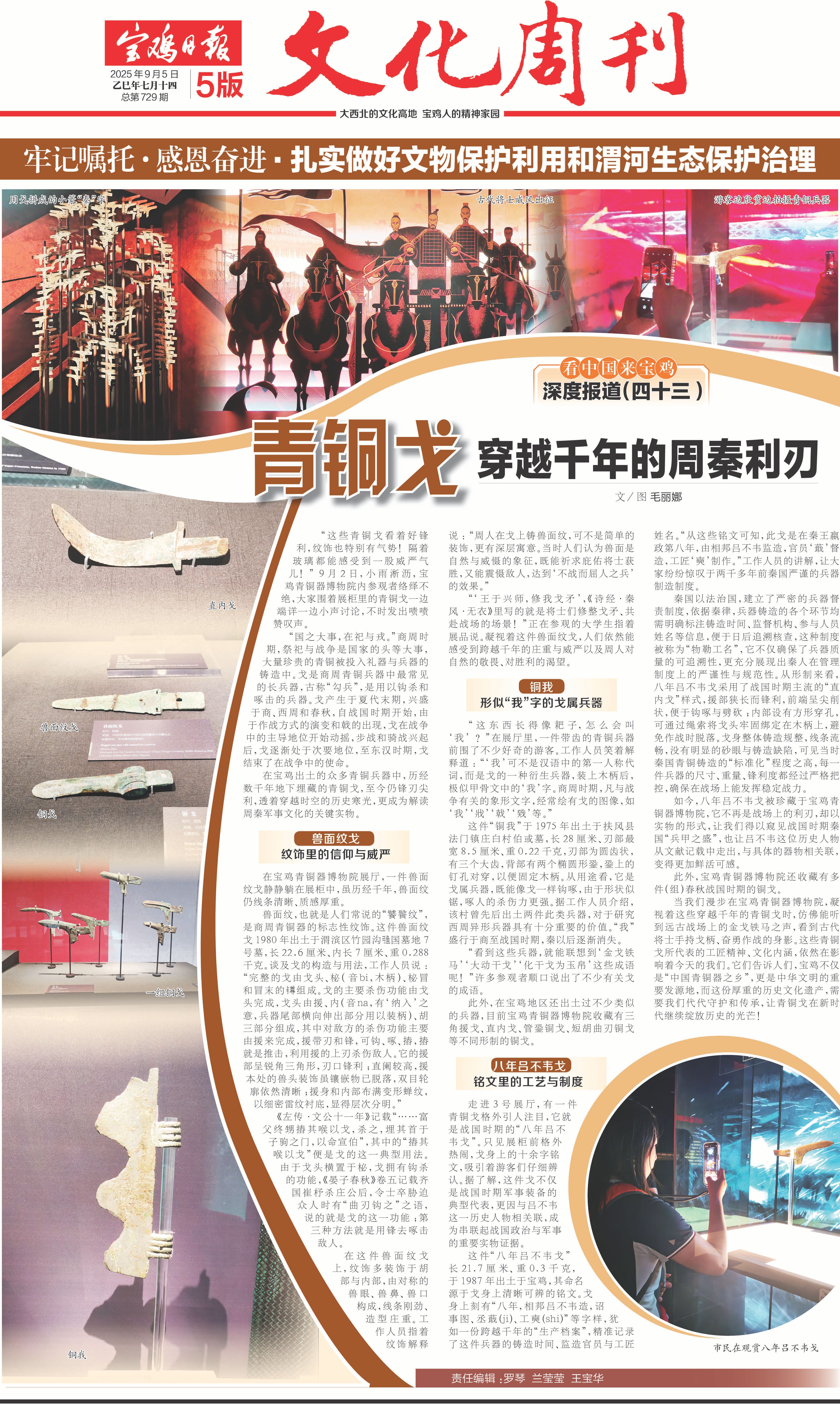 當我們漫步在寶雞青銅器博物院,凝視著這些穿越千年的青銅戈時,仿佛能聽到遠古戰場上的金戈鐵馬之聲,看到古代將士手持戈柄、奮勇作戰的身影。這些青銅戈所代表的工匠精神、文化內涵,依然在影響著今天的我們。它們告訴人們,寶雞不僅是“中國青銅器之鄉”,更是中華文明的重要發源地,而這份厚重的歷史文化遺產,需要我們代代守護和傳承,讓青銅戈在新時代繼續綻放歷史的光芒!(寶雞融媒 毛麗娜)