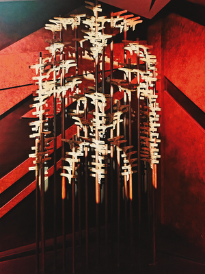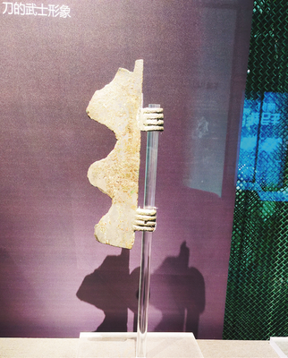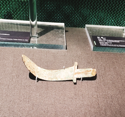 這件“銅我”于1975年出土于扶風縣法門鎮莊白村伯或墓,長28厘米、刃部最寬8.5厘米、重0.22千克,刃部為圓齒狀,有三個大齒,背部有兩個橢圓形銎,銎上的釘孔對穿,以便固定木柄。從用途看,它是戈屬兵器,既能像戈一樣鉤啄,由于形狀似鋸,啄人的殺傷力更強。據工作人員介紹,該村曾先后出土兩件此類兵器,對于研究西周異形兵器具有十分重要的價值。“我”盛行于商至戰國時期,秦以后逐漸消失。