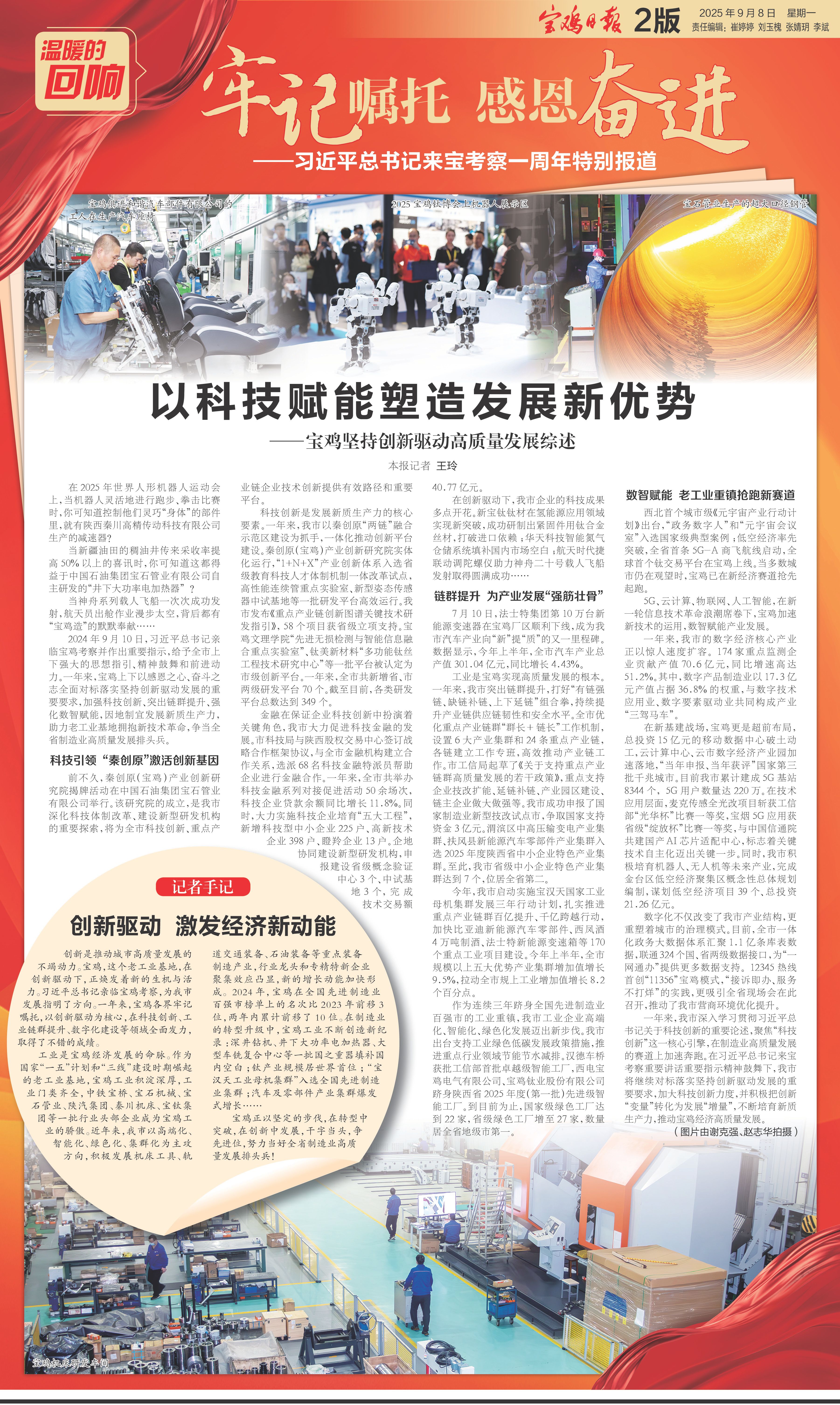 2024年9月10日,習(xí)近平總書記親臨寶雞考察并作出重要指示,給予全市上下強(qiáng)大的思想指引、精神鼓舞和前進(jìn)動(dòng)力。一年來,寶雞上下以感恩之心、奮斗之志全面對(duì)標(biāo)落實(shí)堅(jiān)持創(chuàng)新驅(qū)動(dòng)發(fā)展的重要要求,加強(qiáng)科技創(chuàng)新、突出鏈群提升、強(qiáng)化數(shù)智賦能,因地制宜發(fā)展新質(zhì)生產(chǎn)力,助力老工業(yè)基地?fù)肀录夹g(shù)革命,爭(zhēng)當(dāng)全省制造業(yè)高質(zhì)量發(fā)展排頭兵。